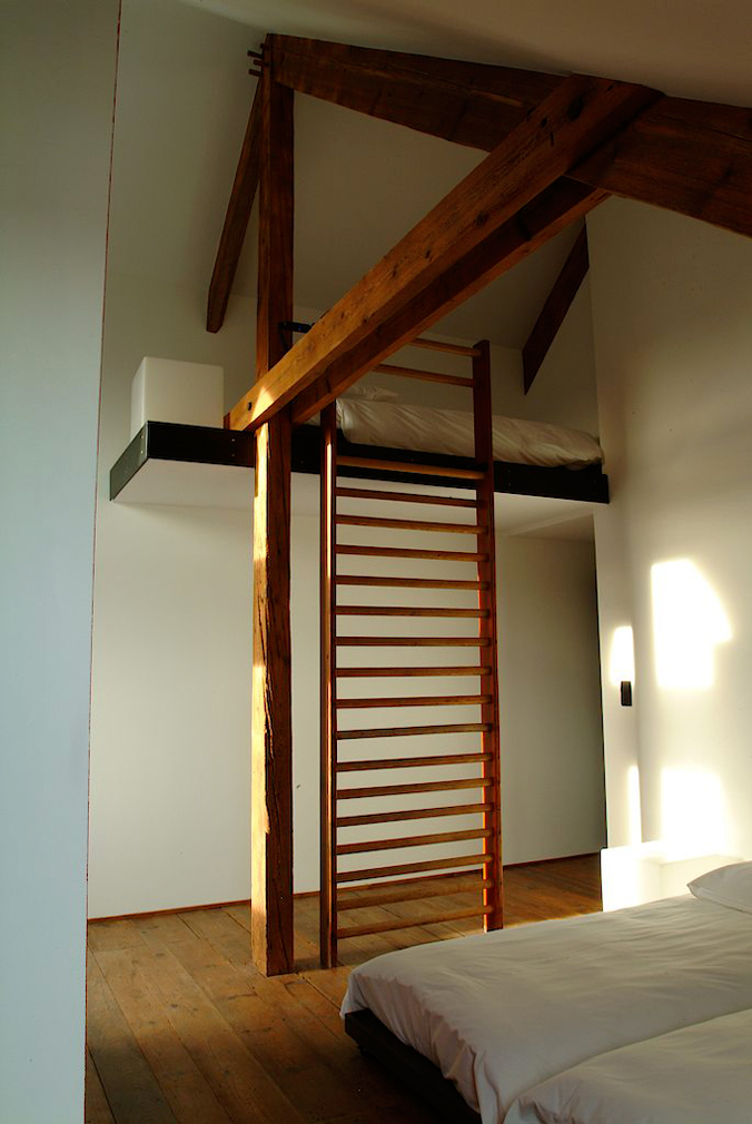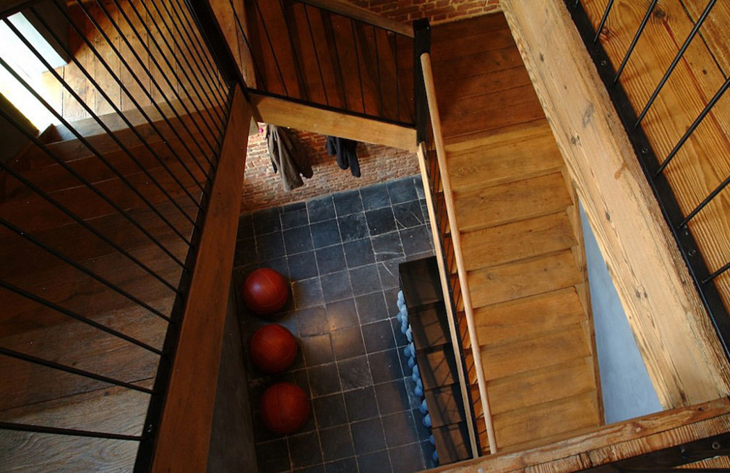 Gymnastics apparatus, stools and chalkboards are strewn across the interior spaces, which feature exposed brickwork, blue stone floors and high beamed ceilings. Meanwhile, bedrooms – seven of them – are named after school subjects.