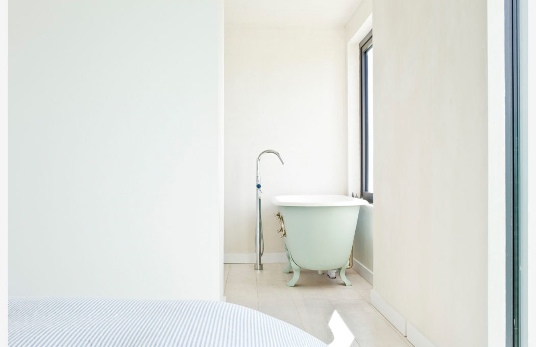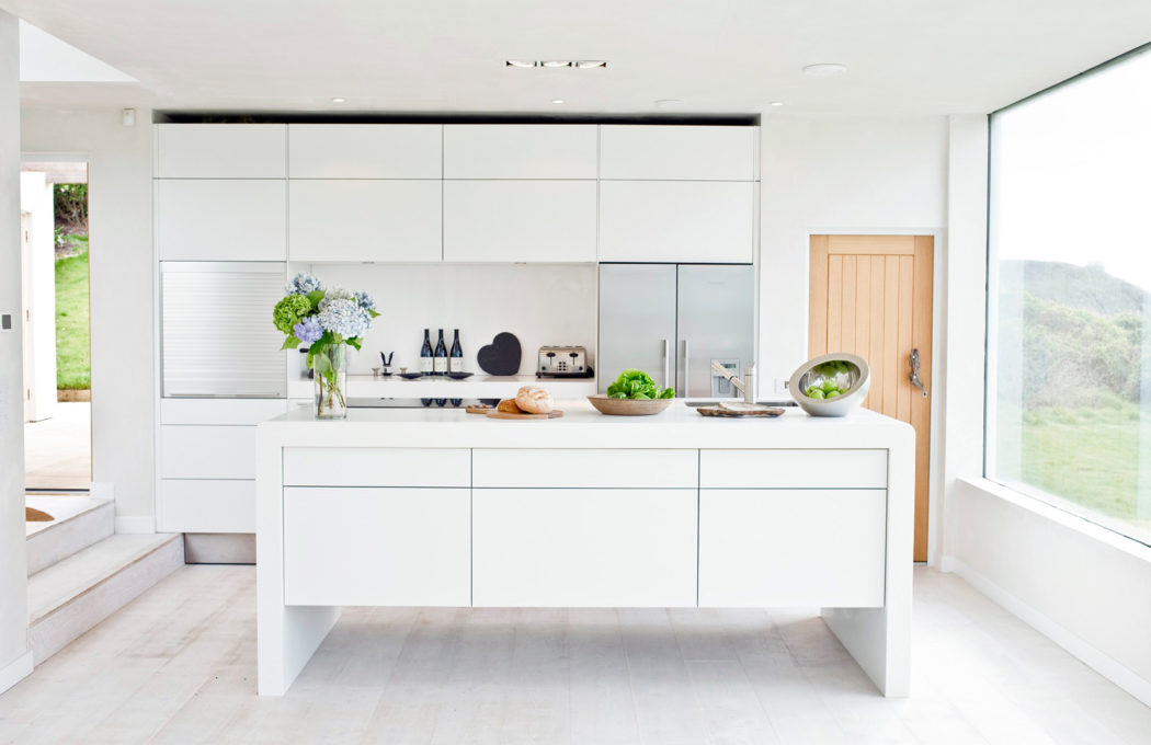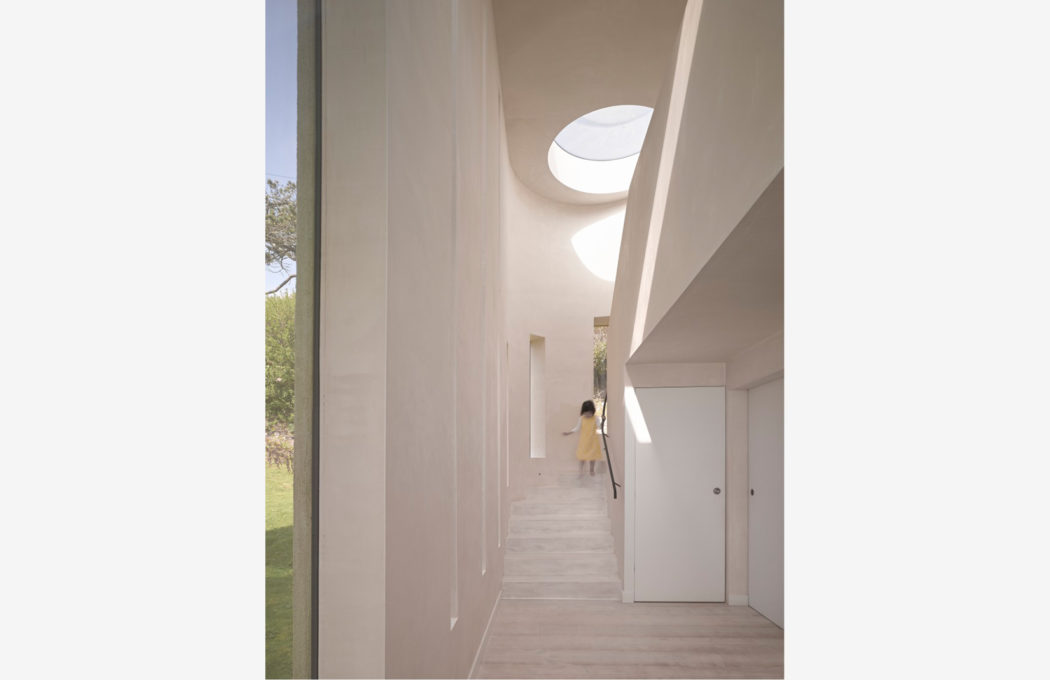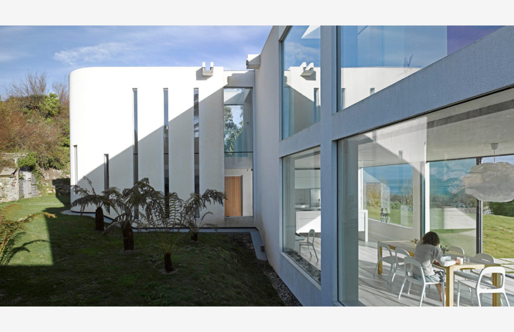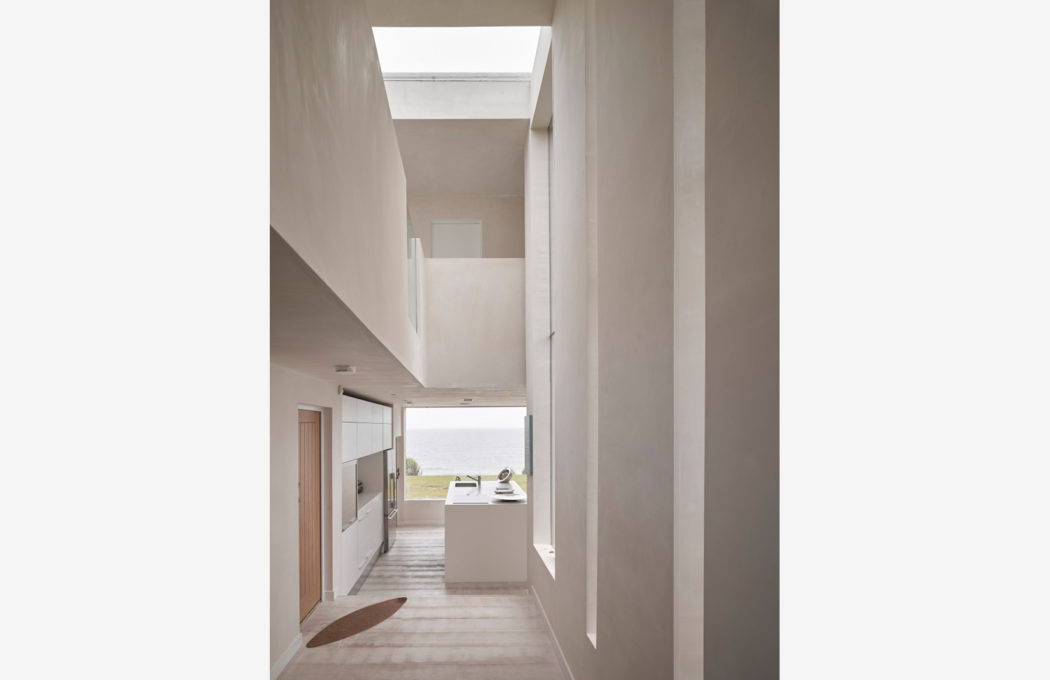 From the outside, the Penzance building’s crisp geometric form recalls Le Corbusier’s famous Villa Savoye, while its white walls are topped with green flat roofs.