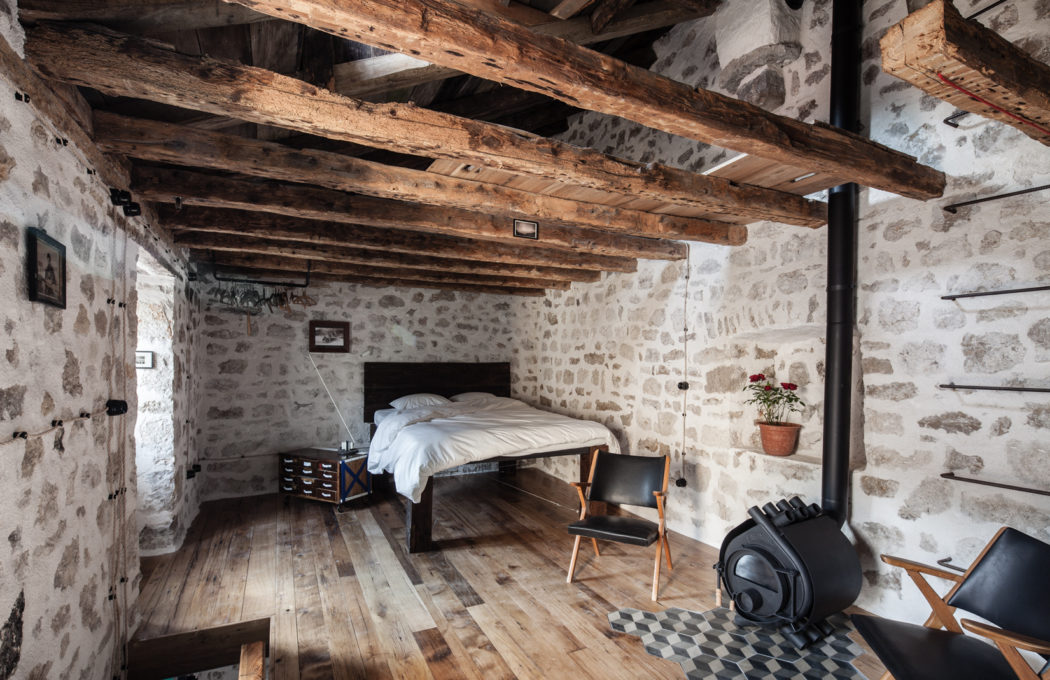 Kajmak restored the property’s stone walls and beamed ceilings in line with strict conservation rules for the village, which is home to less than 550 people. He also installed wooden flooring and furnished the two-storey cottage with a mix of vintage and traditional local furniture.