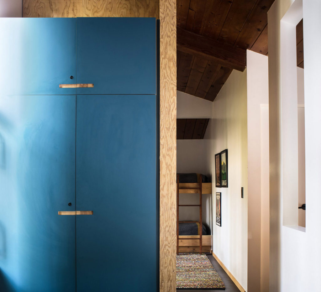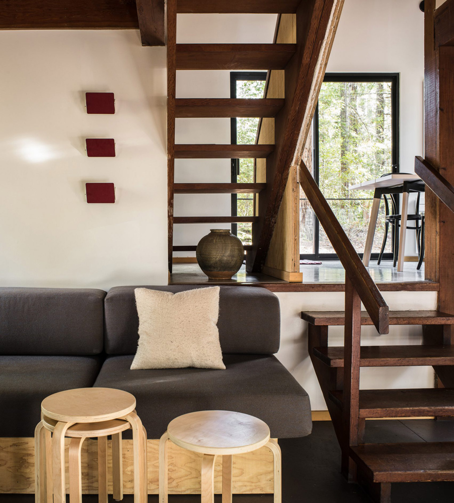 The studio has gently updated the cabin home, using old wood found on the site to add a new folding partition between the home’s two bedrooms. It has also furnished the cabin with a mix of old and new design pieces, including a built-in sectional sofa and artworks by Barbara Solomon Stauffacher – who created the original Sea Ranch logo.