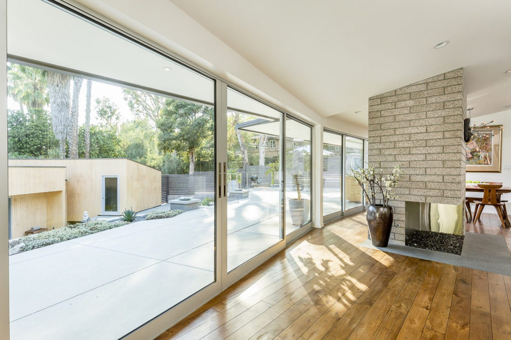 Rooms have large glass walls, pitched ceilings, hardwood floors, and the living room is set around a brick fireplace. Large sliding doors open spaces to the landscaped garden, which is dotted with eucalyptus trees and a swimming pool