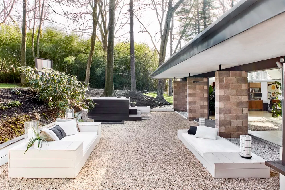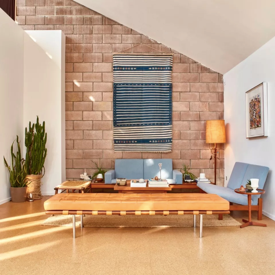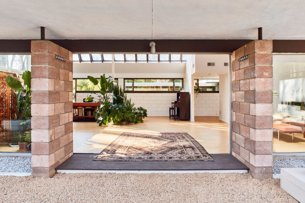 The couple set about restoring the International Style property and bringing back Neutra’s original vision. Hassrick Residence features a 40 ft-glass wall and oversized brick fireplace in the living room.