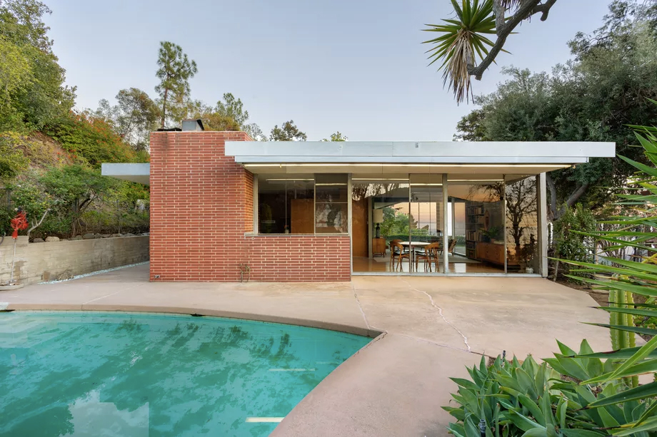 The Elsa and Robert Sale Residence sits on North Tigertail Road in Brentwood, and was built in 1960. The three-bedroom midcentury modern home features Neutra’s signature sliding glass walls and has bespoke flourishes including original mosaics by Elsa Sale (a Dutch-born artist) as well as built-in seating, bookcases and cabinetry.