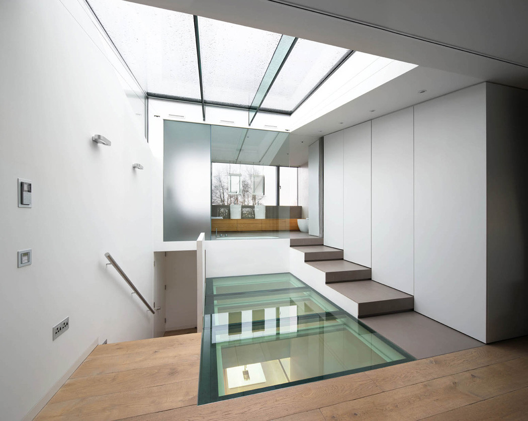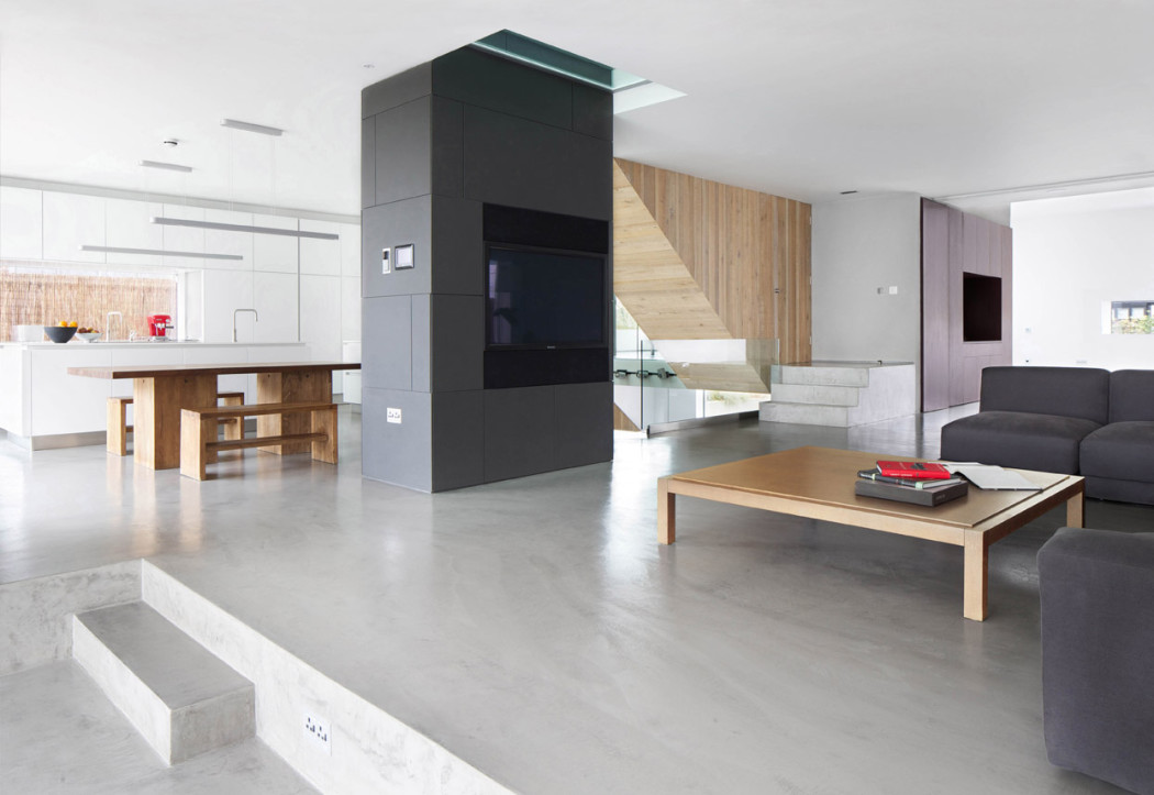 Robert Dye Architects have continued the dialogue between materials inside the house, where polished concrete floors and large windowpanes combine with open-plan spaces to give the lower floors an almost gallery-like feel.