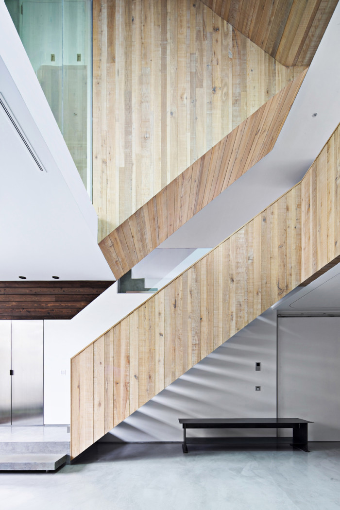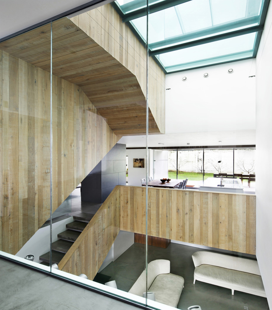 A central void running from the house’s top to bottom connects these individual spaces, dissected by a timber staircase.