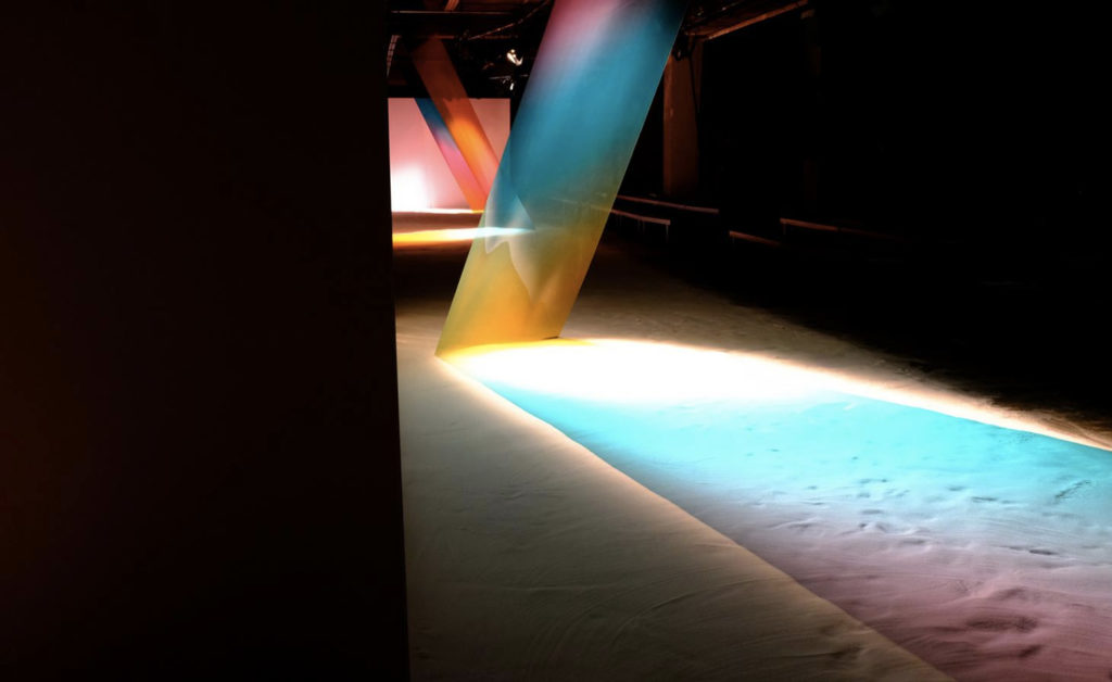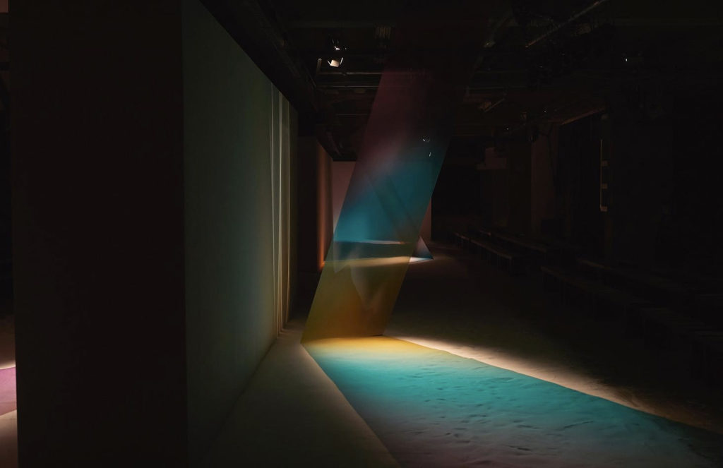 Troika – founded by artists Eva Rucki, Conny Freyer and Sebastien Noel – drew on their Barbican installation, Borrowed Light, for the runway design, which echoes the bright pinks, yellows and blues of Roksanda’s designs. Meanwhile, white lightboxes provided a backdrop for the kaleidoscopic bands of colour.