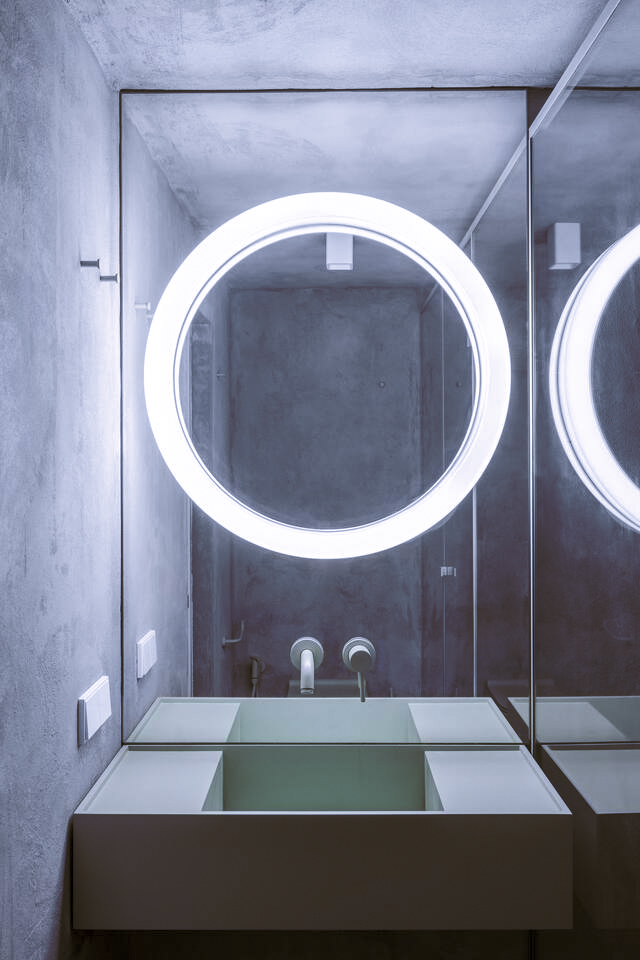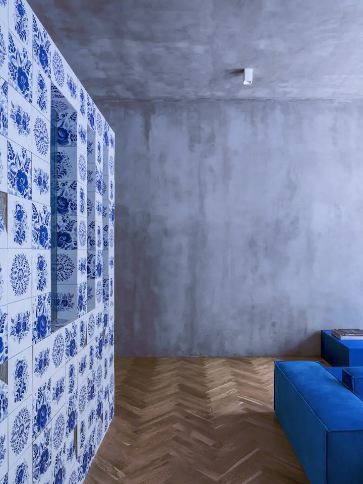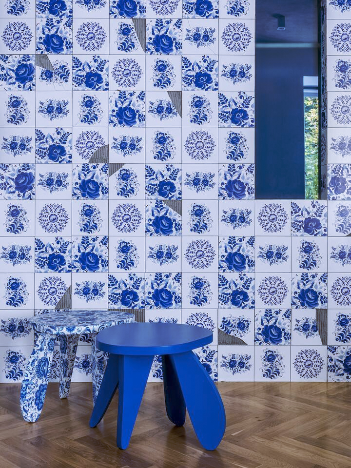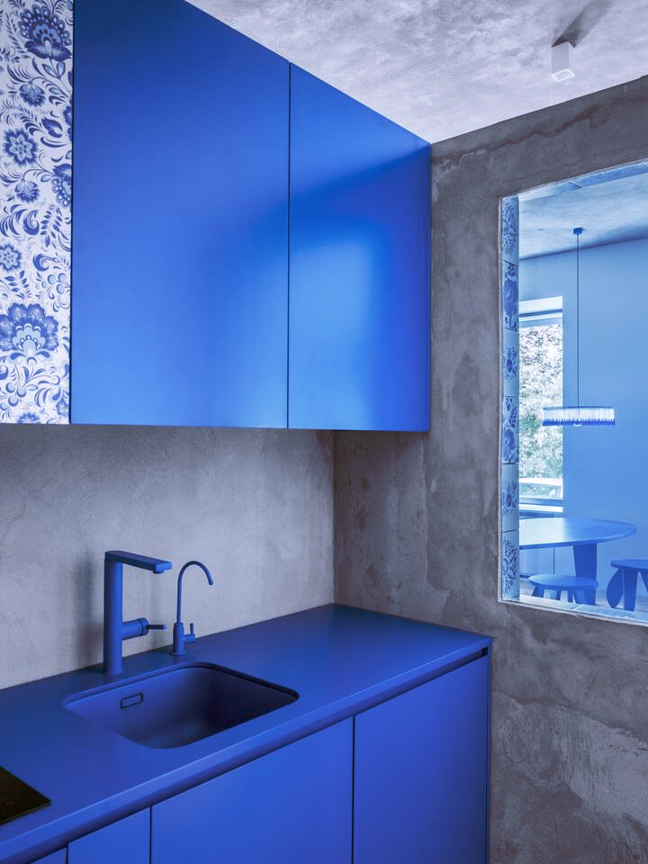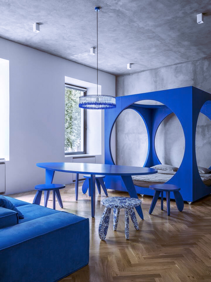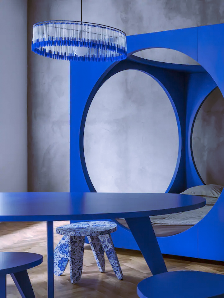 It’s not just about the palette, however. From the cut-out circles of the bed, guests can admire the broken Gzhel tiles that clad the kitchen, and look up to find a chandelier fringed, improbably, with blue biros.
