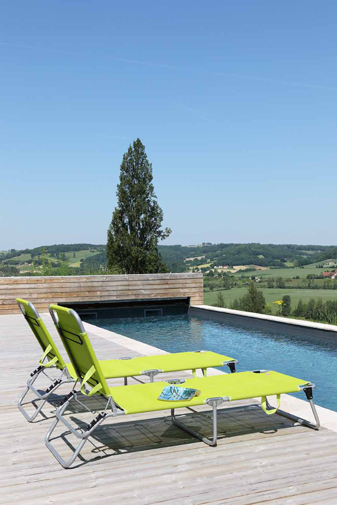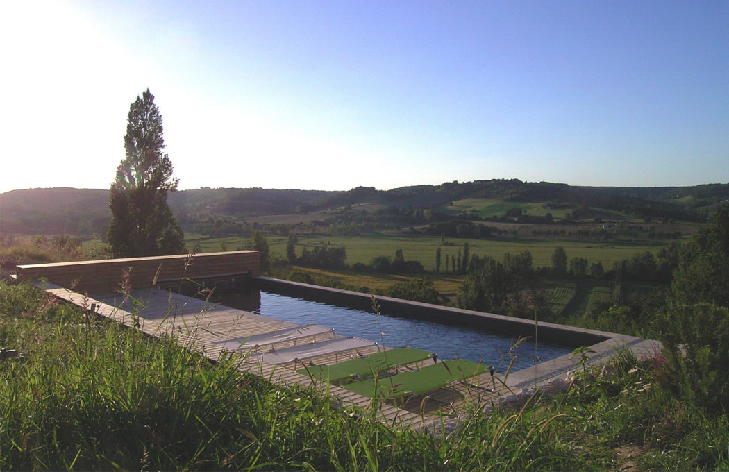Lauzerte House sits on a hillside overlooking the Tarn-et-Garonne valley and has been designed to melt into its surrounding landscape. Constructed using local materials, it features a rubble limestone base and a tawny-coloured upper volume clad in chestnut.