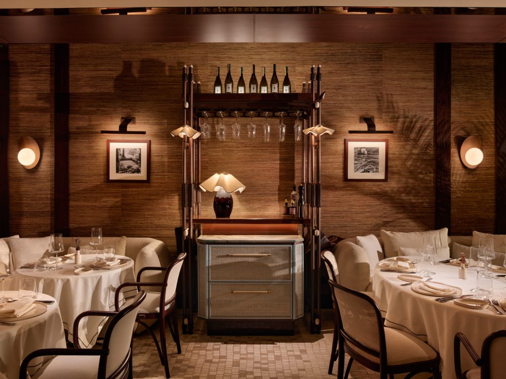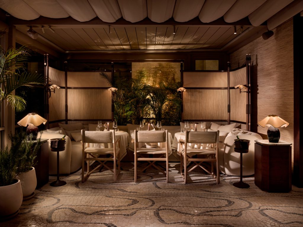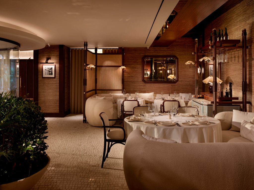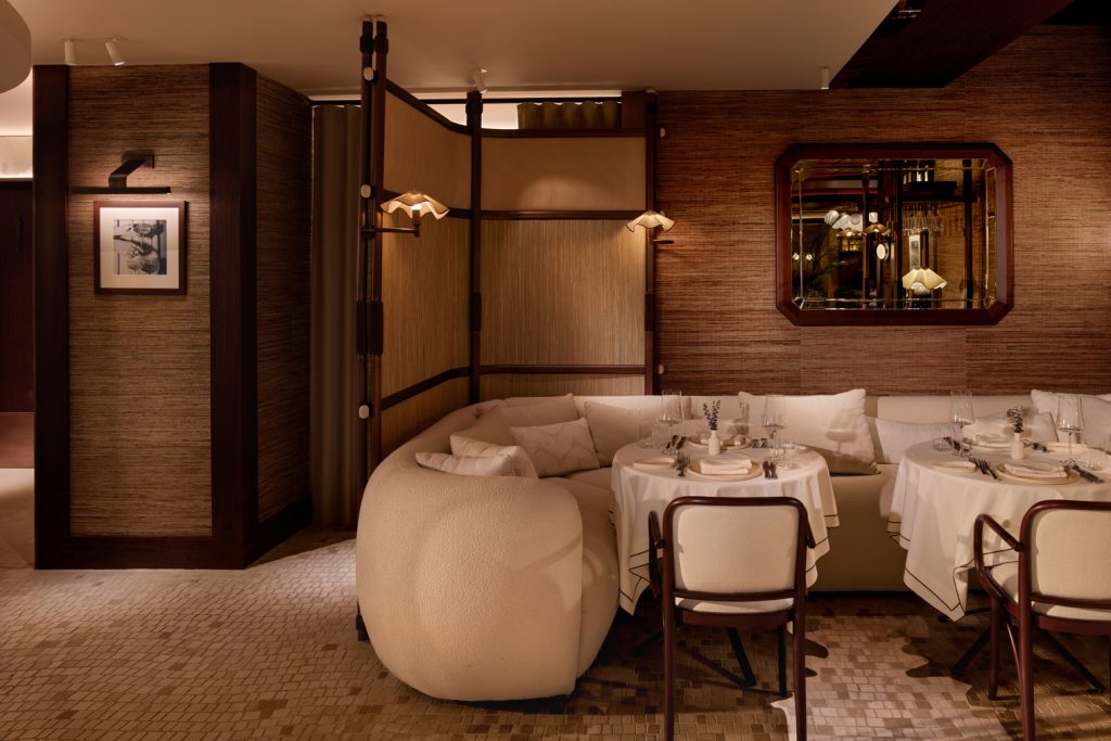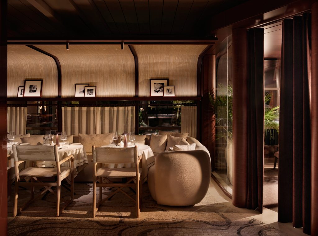 A central wooden bar uses a similar curvilinear structure and functions as an anchor or wayfinder — a social magnet that helps guests orient themselves in the space. In the day, sunlight filters through the curtain system, gradually transitioning into night with bespoke wall sconces, table lamps and integrated LED systems.