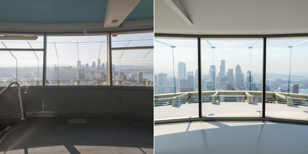 Before and after: the view from inside the Upper Atmos. Courtesy of Space Needle LLC and Olson Kundig