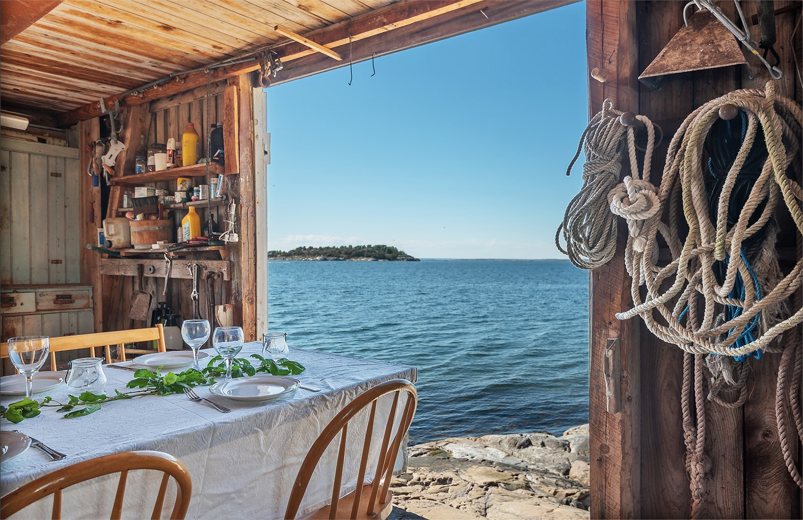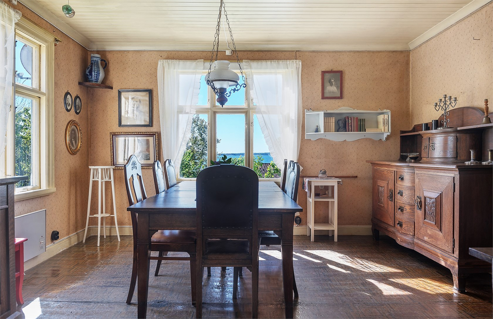 The 126sqm main house has seven rooms: a cluster of bedrooms on the upper floor and living spaces on the ground level, anchored by fireplaces. Original details remain: spröjsade windows, timber floors and the familiar flow of a 1930s plan. Later updates include a replaced roof and practical storage woven throughout. The dining room looks directly toward the boathouse and sea, with the kitchen and adjoining living room forming a continuous flow around the hall. A guest cottage and a traditional utility wing extend the site’s flexibility, offering additional beds and workspace within the 3,065sqm waterfront plot.