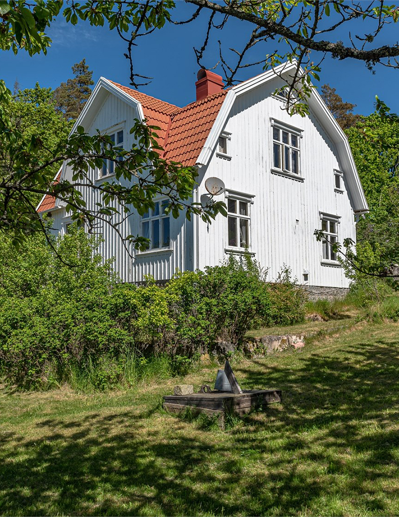 In the far west Swedish coastland of Strömstad’s Lunneviken, this 1930s holiday house rests on a granite outcrop that meets the edge of a sheltered inlet. The property has stayed within the same family since the 1950s, its shoreline setting shaped by a private bathing rock, a boathouse and an orchard that has grown into a mature garden over decades. The retreat feels secluded yet firmly rooted in western Sweden, where rocky islands, pine forest and shifting tidal light set the tone of daily life.