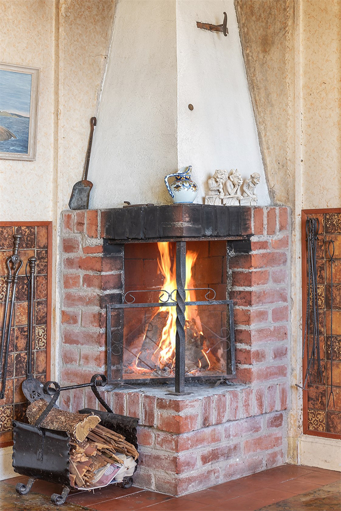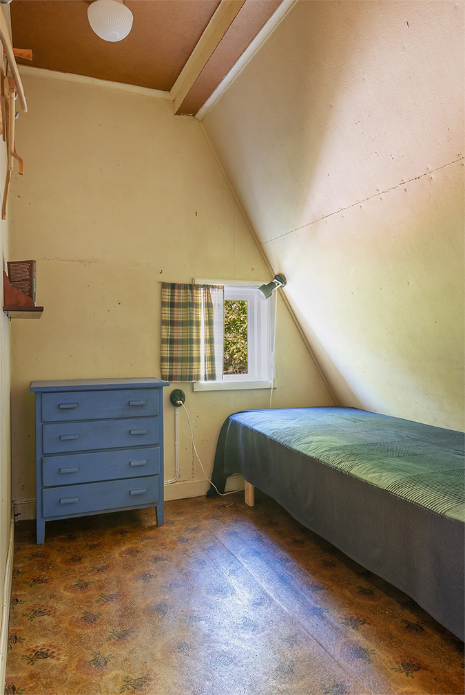 The 126sqm main house has seven rooms: a cluster of bedrooms on the upper floor and living spaces on the ground level, anchored by fireplaces. Original details remain: spröjsade windows, timber floors and the familiar flow of a 1930s plan. Later updates include a replaced roof and practical storage woven throughout. The dining room looks directly toward the boathouse and sea, with the kitchen and adjoining living room forming a continuous flow around the hall. A guest cottage and a traditional utility wing extend the site’s flexibility, offering additional beds and workspace within the 3,065sqm waterfront plot.