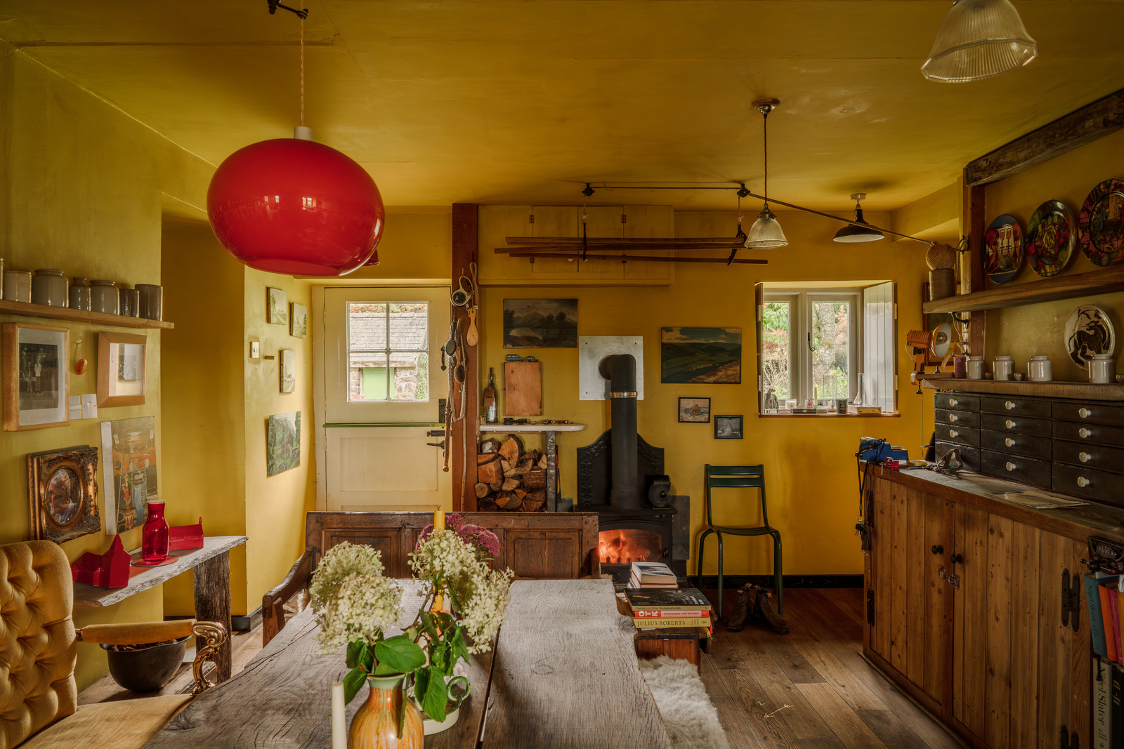 Across 4,200sqm, the interiors reveal their history through texture and proportion. A wide inglenook fireplace anchors the main living room, where a 17th-century oak plank and muntin screen remains in situ. The kitchen, painted in Annie Sloan’s English yellow, balances vernacular warmth with confident colour. Upstairs, the principal suite opens beneath a pitched timber roof, framing long views of the surrounding Elan Valley.