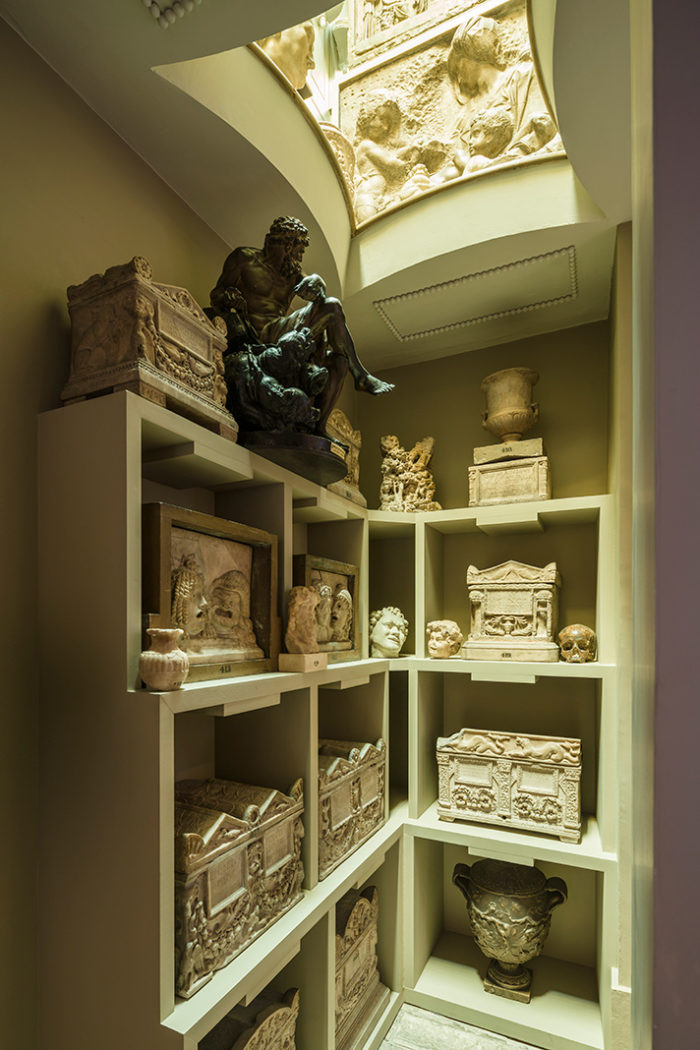 Suites of small connecting spaces have opened up on both the ground and basement floors. The sculpture-lined lobby sits directly above the catacombs. Both are illuminated with natural light filtered through roof lanterns fitted with yellow glass.
