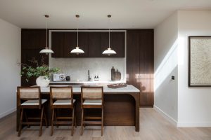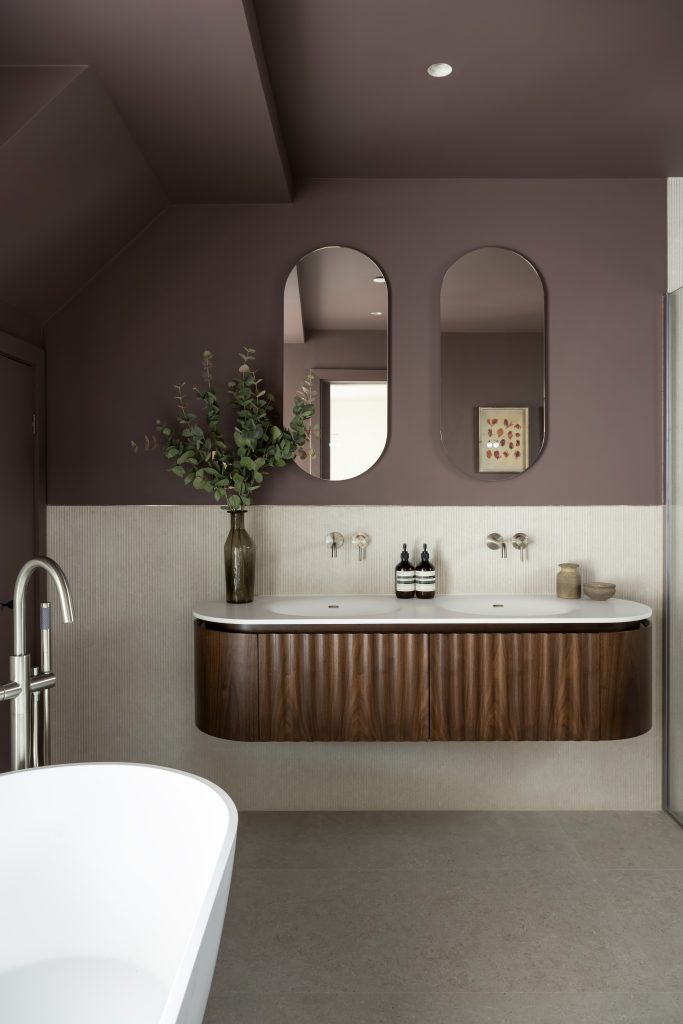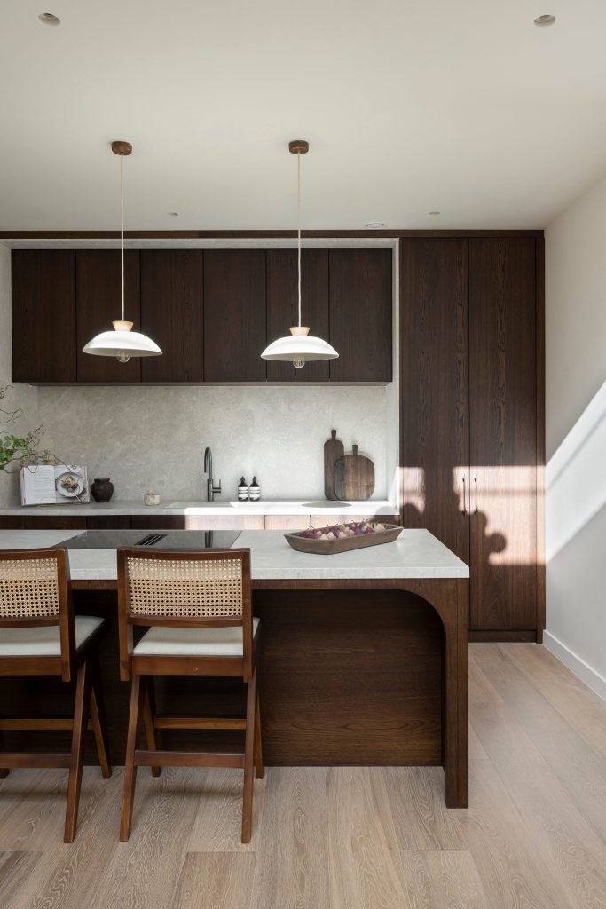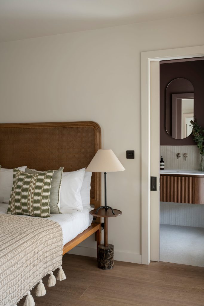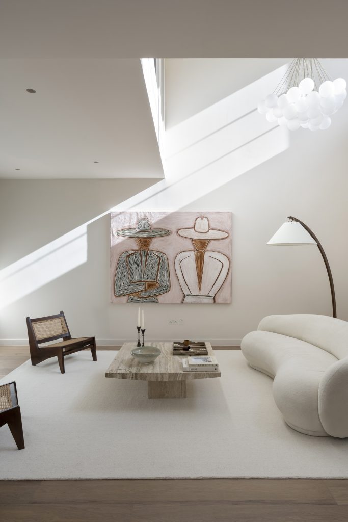 Above, two bedroom suites are positioned at either end of the plan, set back from the void and overlooking the space below. Fluted glazing introduces borrowed light into enclosed areas. Materials are restrained, including limestone surfaces, timber joinery and bronze hardware.