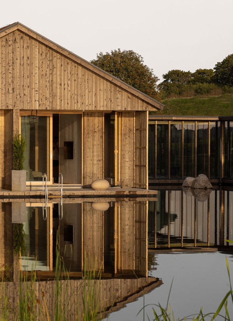 Kasper Rønn Von Lotzbeck and Jonas Bjerre-Poulsen of Norm used oak cladding, vernacular green roofs and expansive banks of glass to bring nature into the very essence of each space – and immerse the spaces themselves into the surrounding landscape. Textural oak louvres within the rooms demarcate functions and provide privacy while allowing sunlight to permeate the interior. The interplay of light and reflected water on the walls and ceilings deliver a sort of ‘artwork’ that excites and calms in equal measure. Built-in oak furnishings eliminate the need for busy decor beyond warm upholstered seating and ceramics.