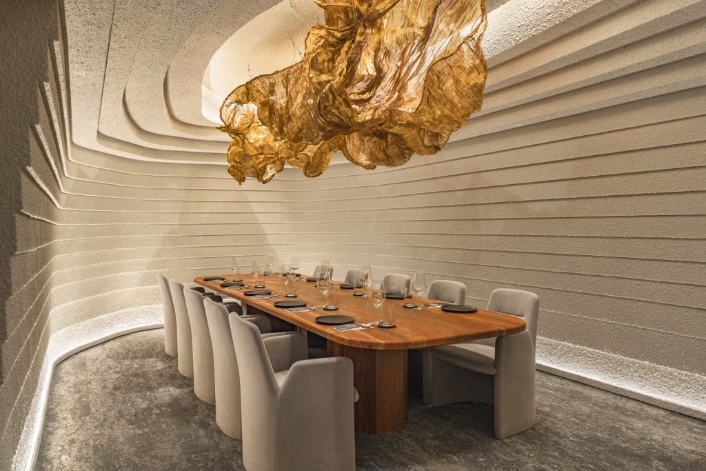 In the private dining room, striated grey travertine takes over, resembling natural limestone. More gold-mesh ‘flames’ lick the air over the red travertine table, which extends to accommodate 12 diners. Communal dining, after all, is part of the concept.