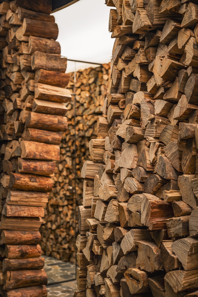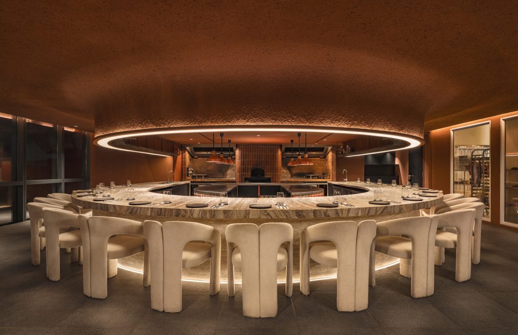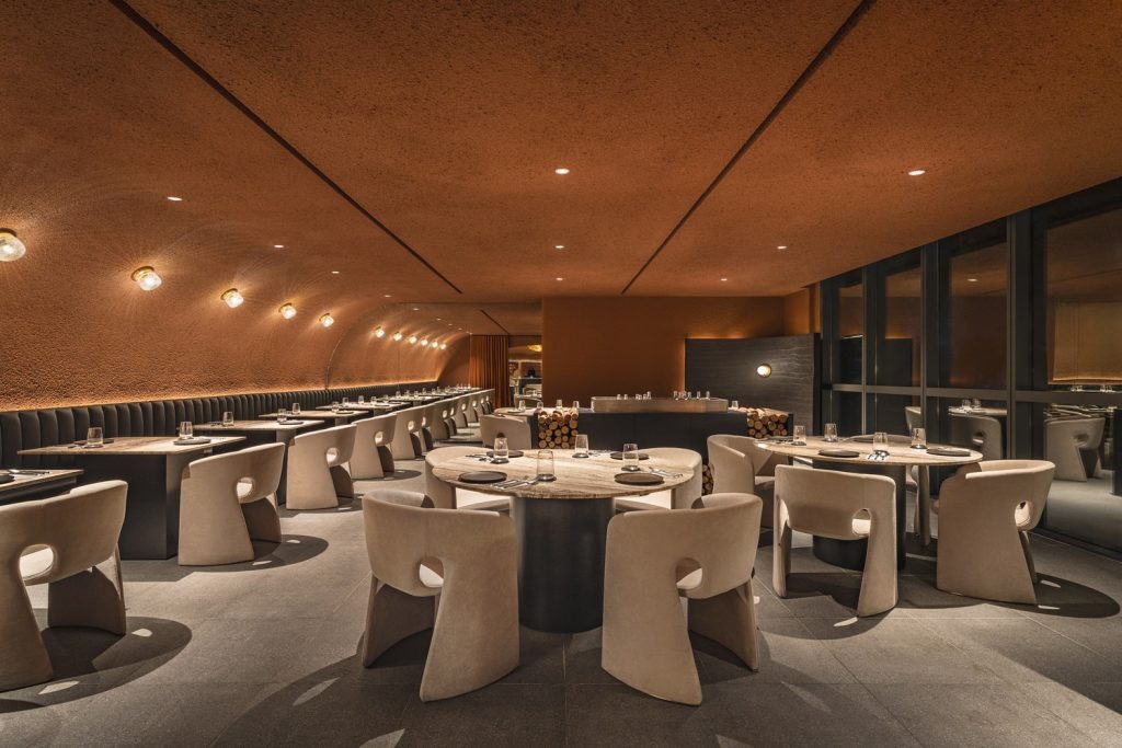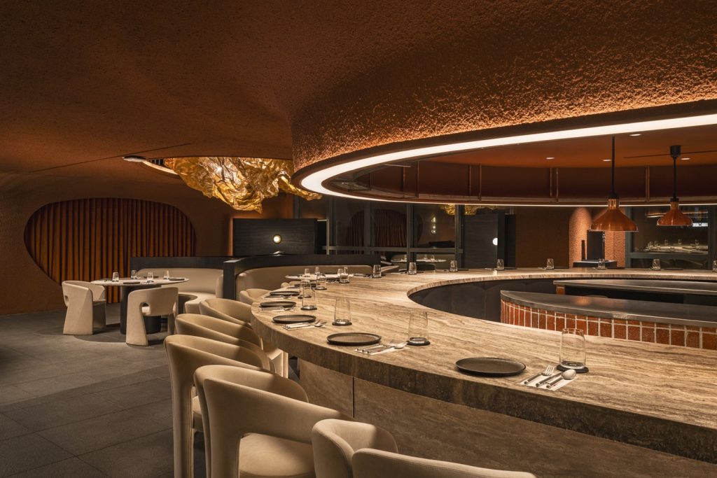 Guests approach Barkar through a rammed-earth arch into a corridor lined with firewood. The space opens up into a rambling organic-shaped dining room enveloped in rough terracotta stucco inspired by ancient earth pits for smoking and cooking food. Spacemen’s Edward Tan designed pedestal tables and chairs like indigenous sculptures that orbit around a circular bar. The stoneware resembles frozen lava, and the fiery gold-mesh sculptures mirror the active flames from the ember-grilled barbecue behind the bar.