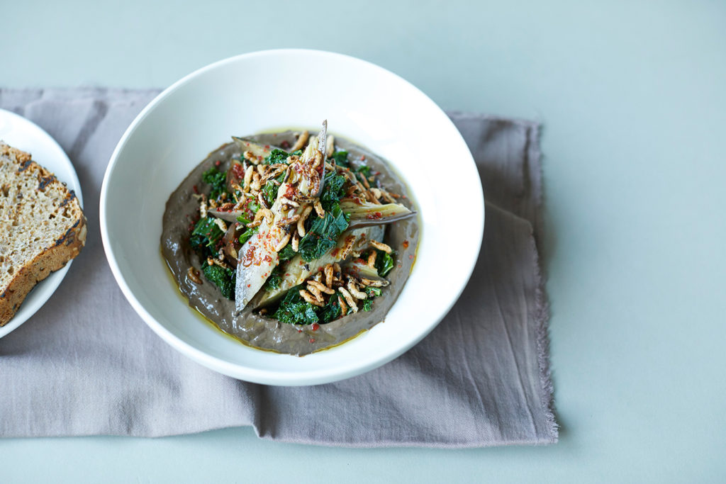Aubergine with wild rice, black garlic tofu and kale. Photography: Lucy Richards