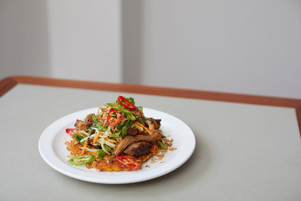 Kimchi rosti, slaw and pickled chillies with pulled pork. Photography: Lucy Richards