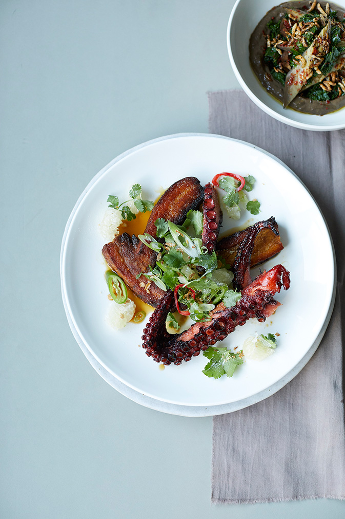 Sweet and sour pork belly with octopus pomello and coconut ground rice. Photography: Lucy Richards