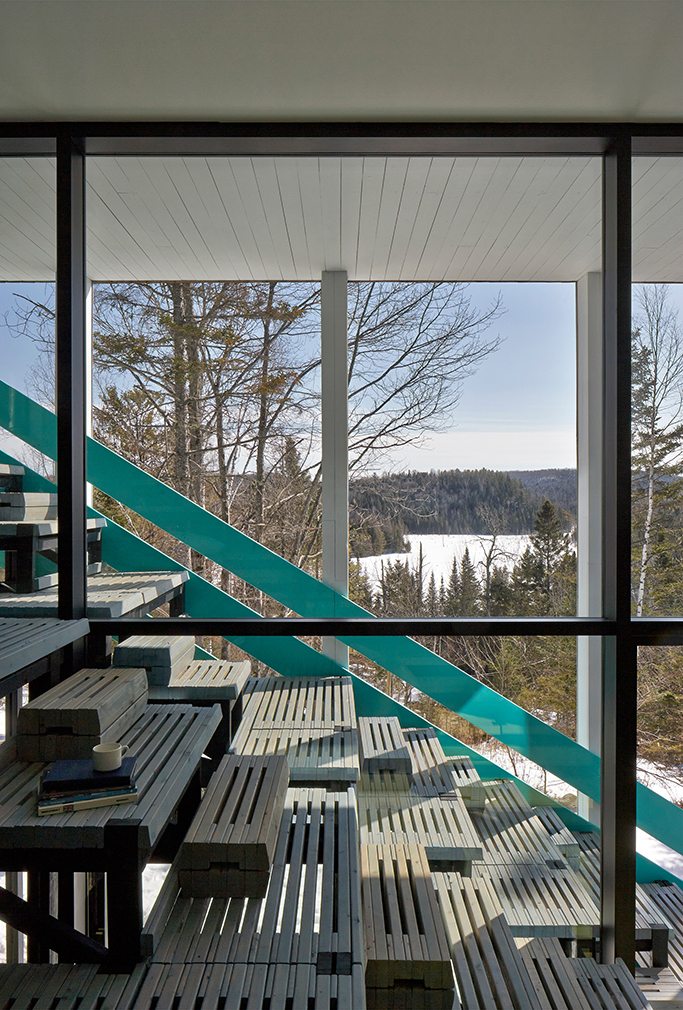 A modular structure with cascading levels takes up the south side of the building, functioning as an indoor viewing platform for the rural surrounds – cloaked in snow during the colder months.