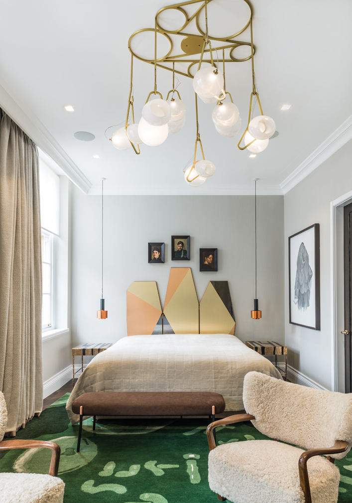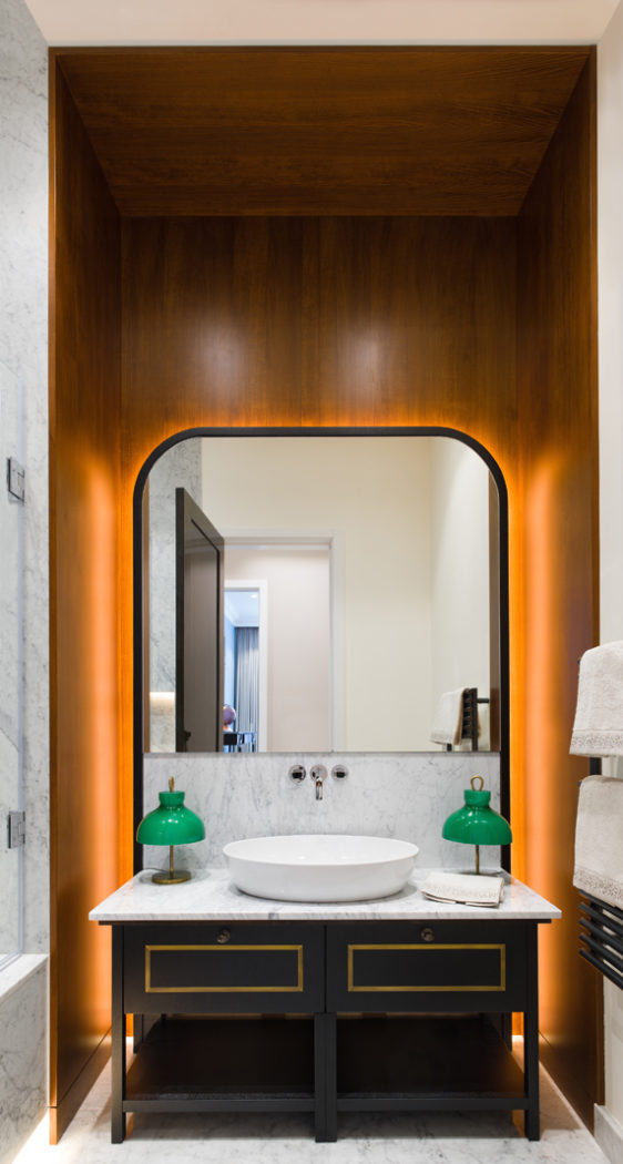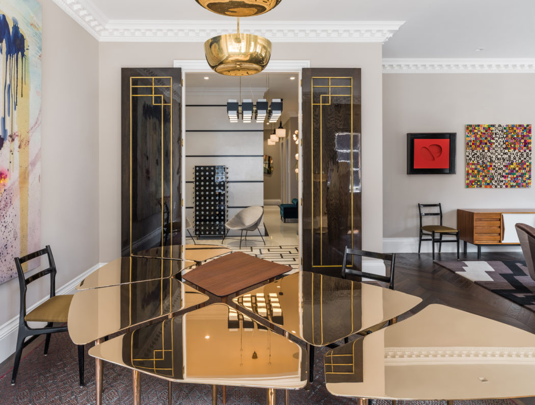 Misra’s role was fleshing out the bones of the 2,355 sq ft apartment – one of her own development projects – which features soaring 3-metre-high ceilings and chevron dark oak flooring throughout. Doors have been heightened to add drama and scale while the kitchen and bathroom are designed bespoke.
