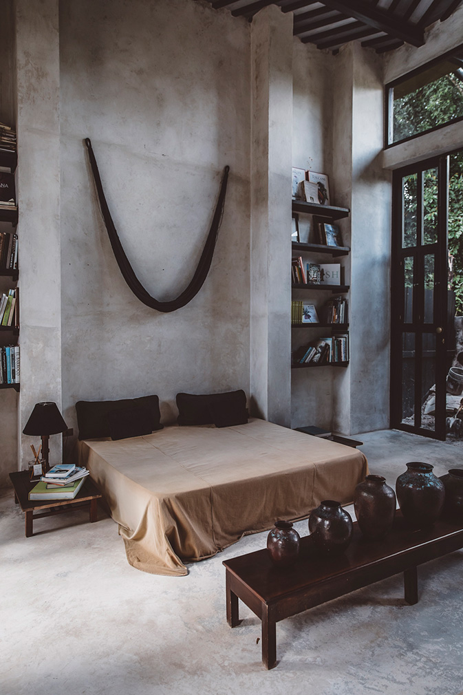 Furniture and objects have been collected from the couple’s travels, while minimalist flourishes can be found in the Mexican holiday home’s bedrooms. They have textured concrete floors and walls and monochrome accents.