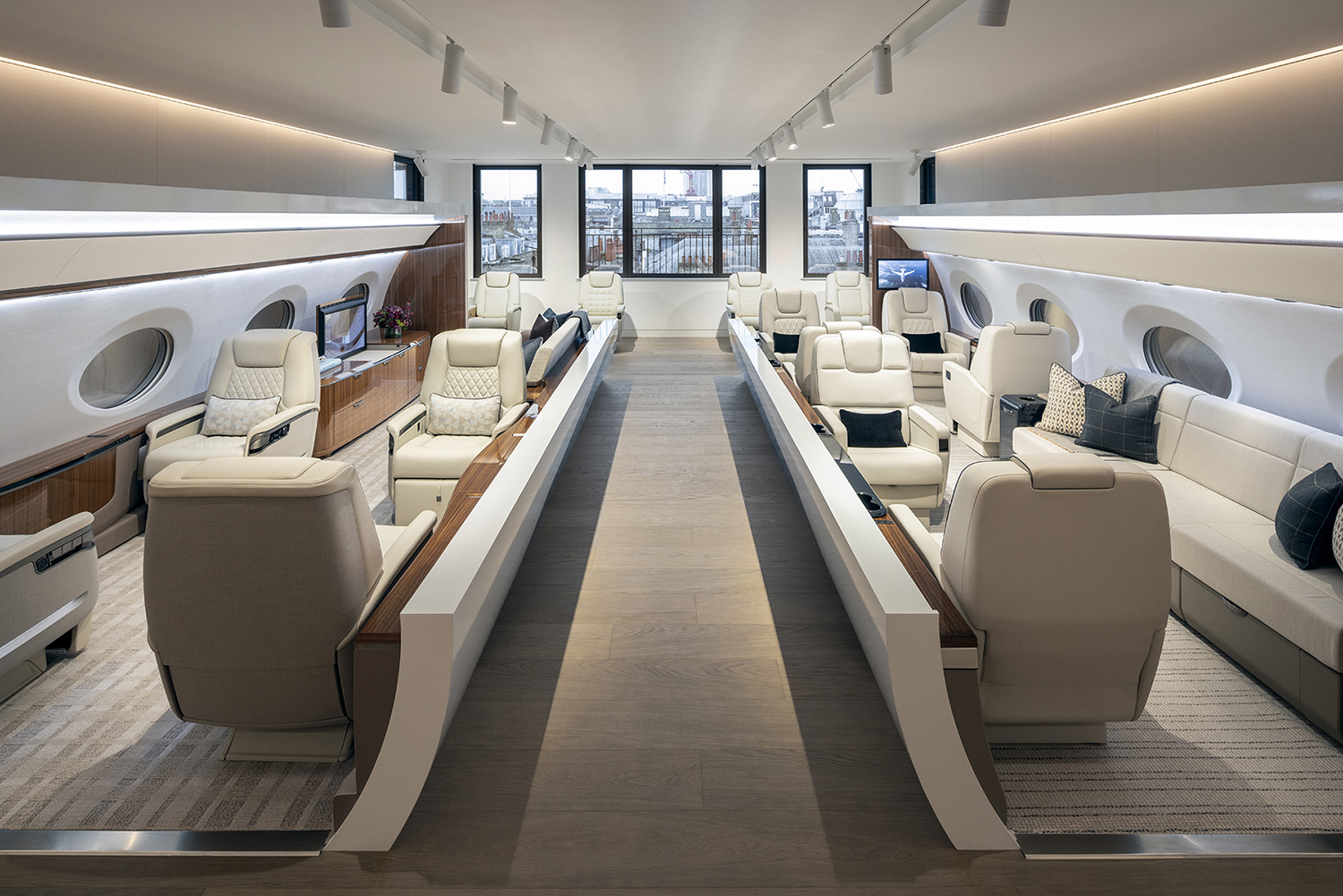 According to Crow, designing the bespoke interior of a private aircraft takes three months to a year. After initial consultations, clients view potential cabin layouts in large-scale 3D format, exploring flatbed arrangements, galley sizes, open bars and meeting ‘rooms’. They move on to a lounge with the incredible scent of a carpet retailer, where seats and sofas of varying widths showcase the range of fabrics, stitching, patterns, bolsters and cushion densities for the G-500 to 800 jets. These go well beyond beige, though with many planes shared between multiple users, buyers tend to keep things neutral — ‘aggressively neutral’, according to Crow. And they demonstrate the ‘art of the possible’: Loro Piano cashmere inserts, massage and heating capability, hidden trays and cupholders, metal plating, timber finish and acoustic fabric surrounds.