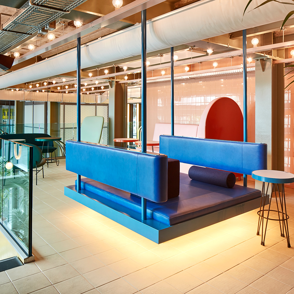 Stam adds: ‘They called this building the “horizontal skyscraper”, so we thought it’d be funny to have a skyscraper feature inside the [restaurant]. We made elevator day beds that hang from the ceiling in each space, and each has a different colour and shape.’