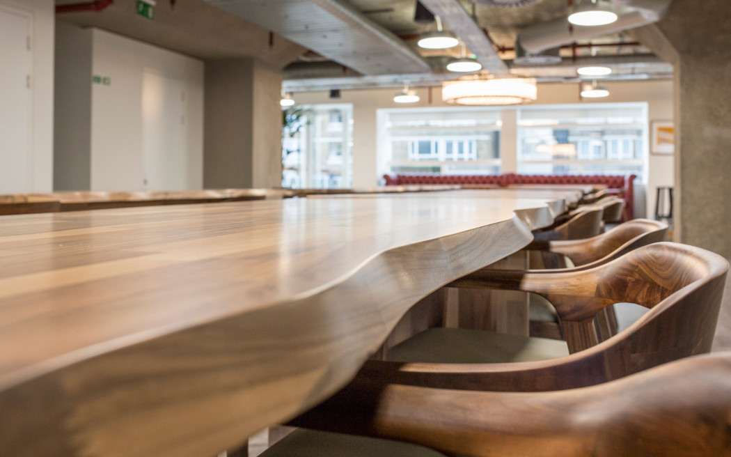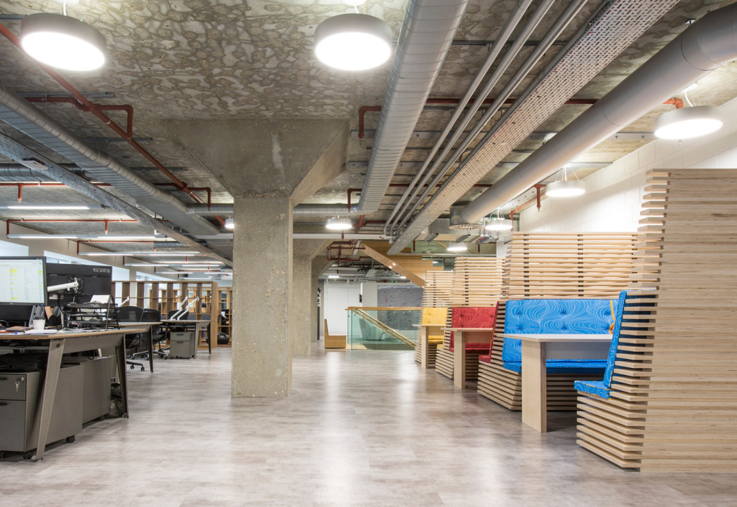 Each of the large, industrial-style HQs is filled with furniture designed by Studiofibre or custom-made by an eclectic group of suppliers. A variety of textures and finishes also give the spaces a tailored feel. In the 38,000 sq ft London HQ, for example, concrete floors and ceilings are offset with slatted wooden booths, bamboo tables and a marble reception desk.