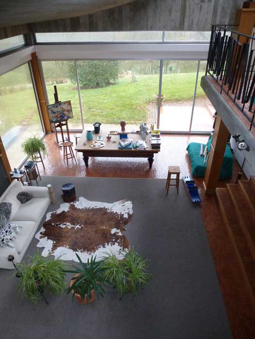 ‘Supermodernist’ architect Parent set the French property over a single level with enormous picture windows framing views of the landscape. The first volume houses Bordeaux Le Pecq ’s former workshop, living room and kitchen. A space between the two curved roof edges is fitted with a skylight that channels light into the interiors spaces below, including a mezzanine level studio space overlooking the living room.