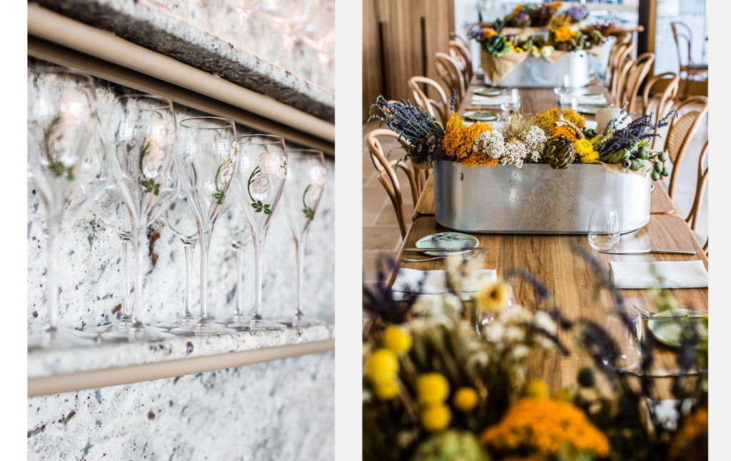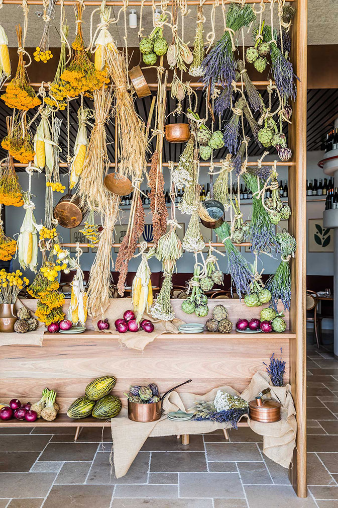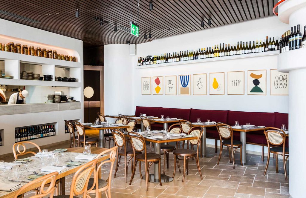 Long trestle tables recall French markets, but have been divided to create private booths, while chairs give a hint of the French Riviera and Mediterranean sun.