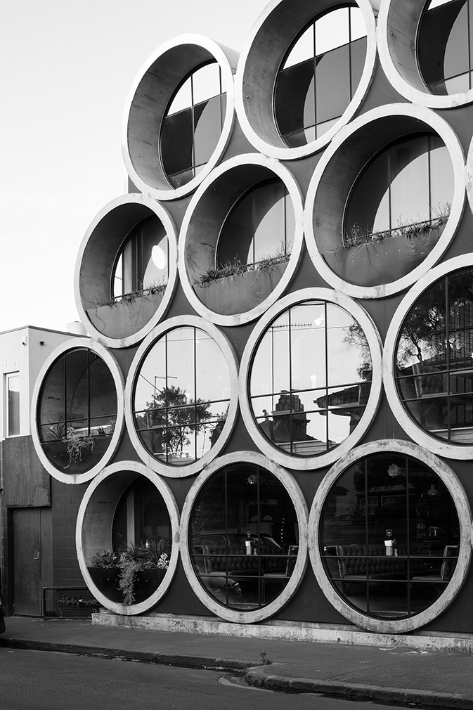 Set into the 2013-built extension to the art deco Prahran Hotel is a series of precast concrete pipes, which, clad in glazing, look like ship portholes. Their timber-clad interiors provide seating areas for diners, and views into the hotel.
