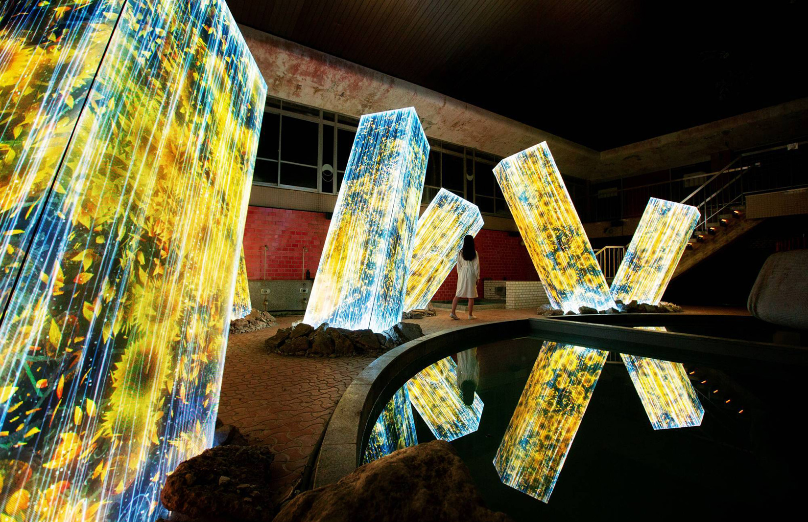 Monolithic ruins are embedded in the ground of the Kyushu park’s abandoned bathhouse, acting as a 3D canvas for digital projections. These colourful artworks follow the lifecycle of flowers as they blossom and decay, and are continuously rendered by a digital programme based on the movement of visitors.