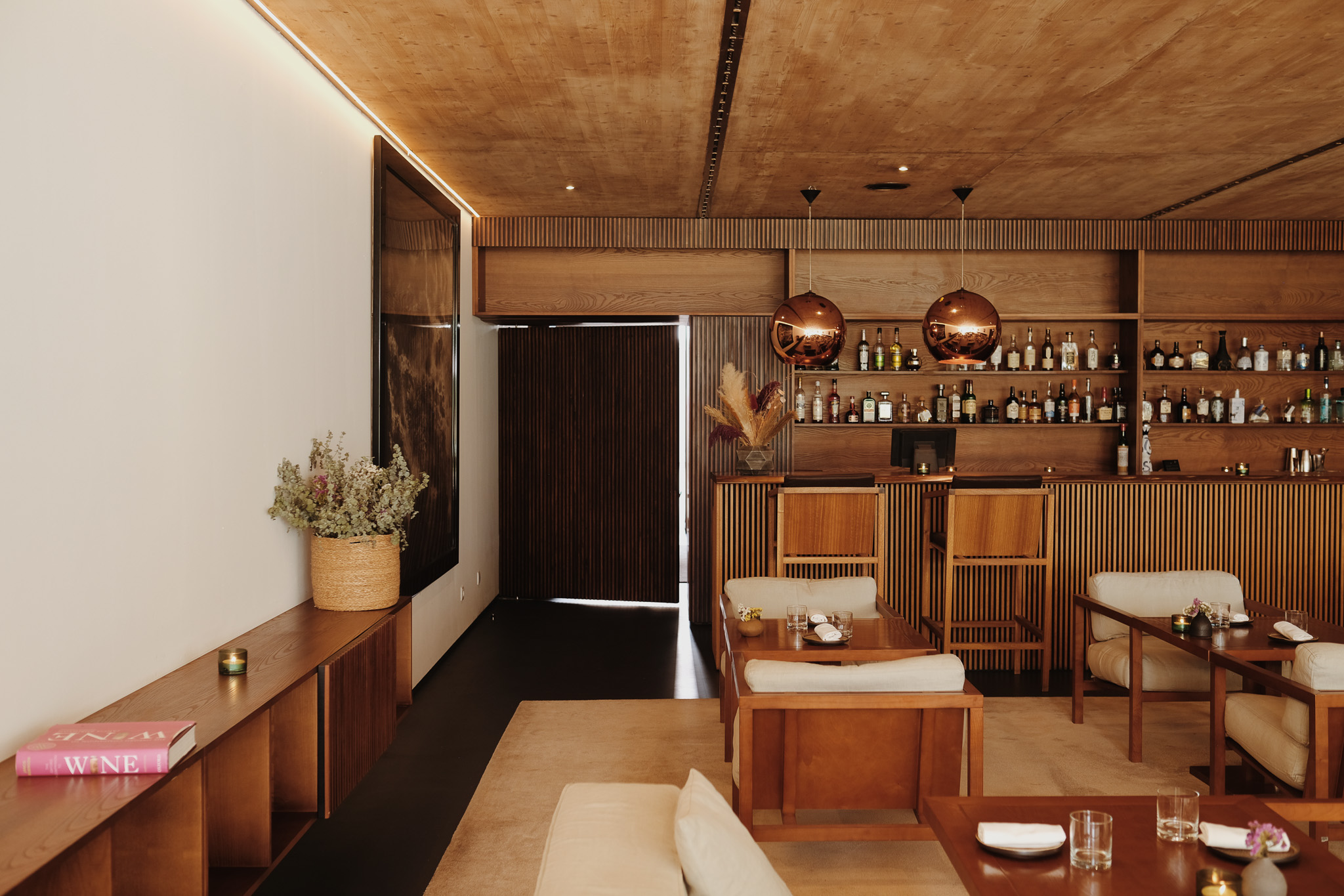 The main building, conceived by architecture practice Promontorio, is a hinged prism inspired by the white-walled patios of Alentejo. It serves as a winery while also housing the lobby, restaurant, clubhouse and spa, which features an indoor pool. The interiors, designed by Brazilian architect Marcio Kogan of Studio MK27, reflect the rural essence of L’And, with wooden panels and warm lighting that soften the stark geometry of the building. Furnishings with earthy tones and rich textures include iconic pieces by Tom Dixon, Jorge Zalszupin, Vladimir Kagan and George Nakashima, and help create an intimate yet sophisticated ambience.