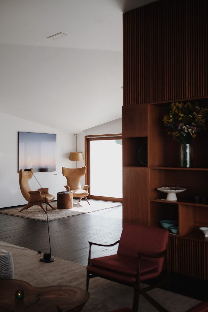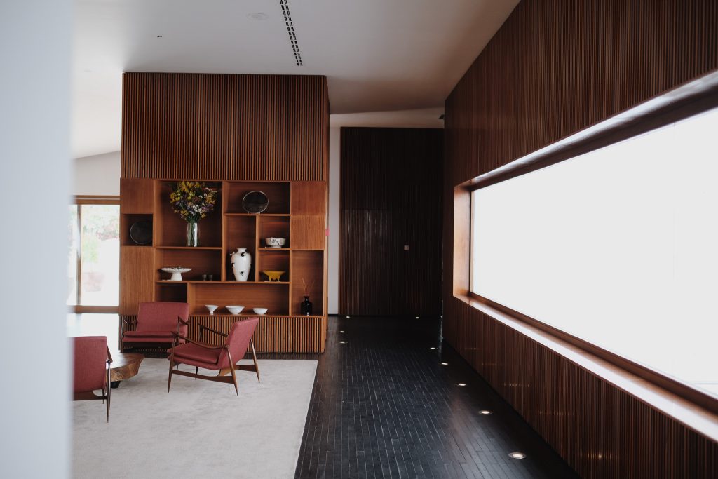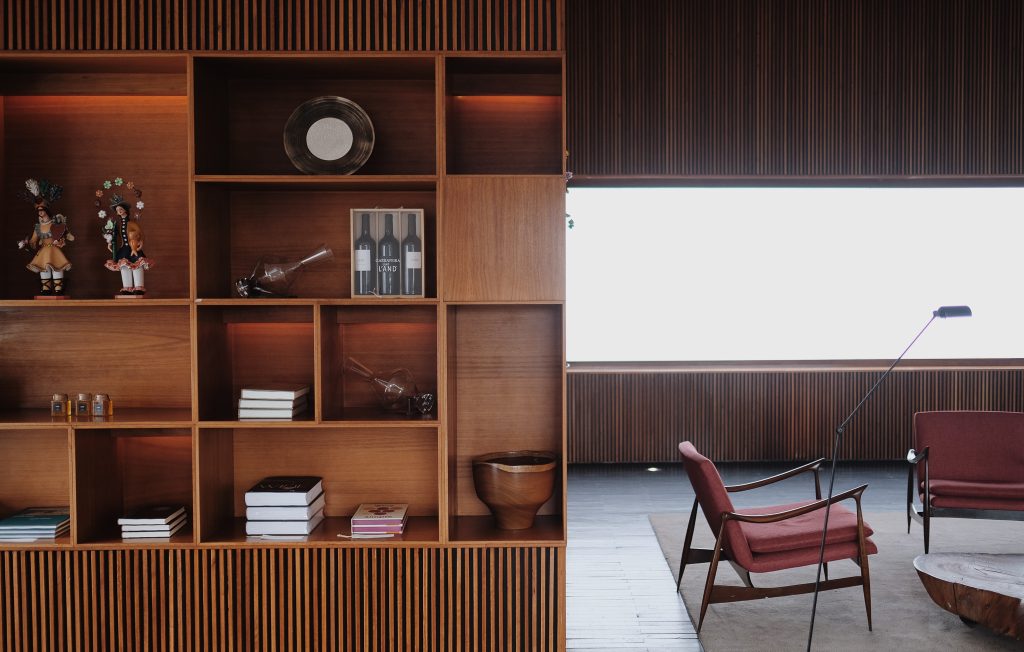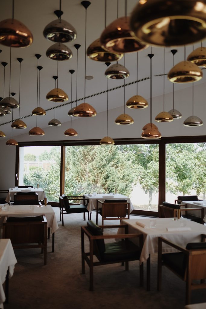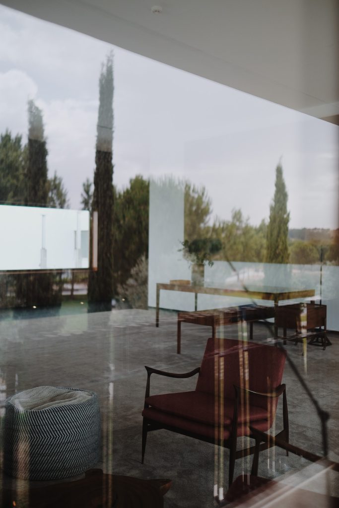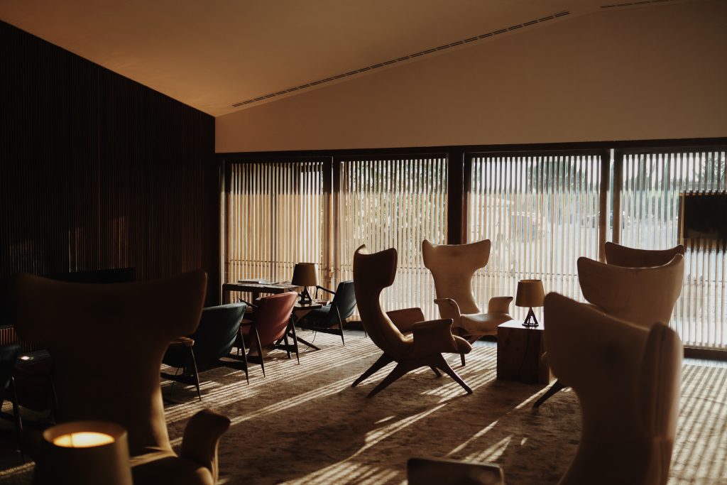 The main building, conceived by architecture practice Promontorio, is a hinged prism inspired by the white-walled patios of Alentejo. It serves as a winery while also housing the lobby, restaurant, clubhouse and spa, which features an indoor pool. The interiors, designed by Brazilian architect Marcio Kogan of Studio MK27, reflect the rural essence of L’And, with wooden panels and warm lighting that soften the stark geometry of the building. Furnishings with earthy tones and rich textures include iconic pieces by Tom Dixon, Jorge Zalszupin, Vladimir Kagan and George Nakashima, and help create an intimate yet sophisticated ambience.