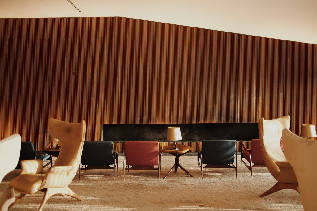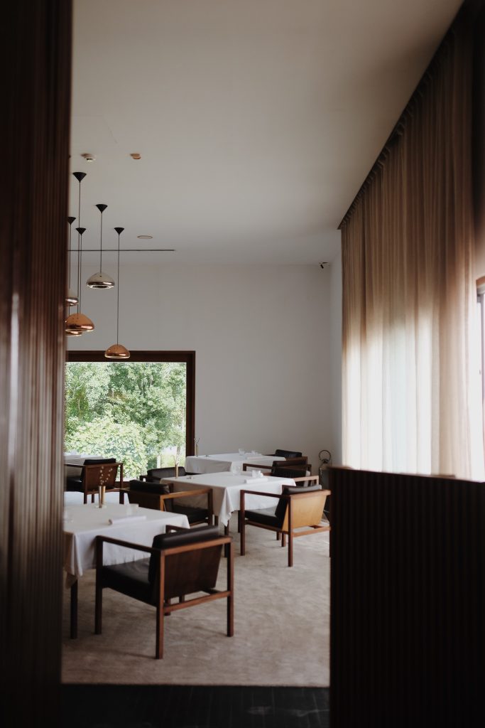 Two in-house restaurants complete the experience. MAPA, led by chef David Jesus, serves Portuguese cuisine infused with global influences from a wine-savvy menu focused on local bottles. Its minimalist space is flooded with natural light from expansive windows with sweeping views of the countryside, and lit by a cascade of Tom Dixon lamps. Café da Viagem is an indoor-outdoor space celebrating the art of travel, with soft creamy seating and wood panelling overlooked by a Brutalist concrete ceiling. Artworks by Michael Biberstein, Fernando Marante and Marcio Villela complete the scene.