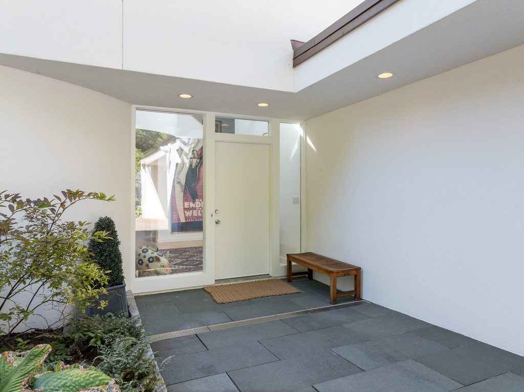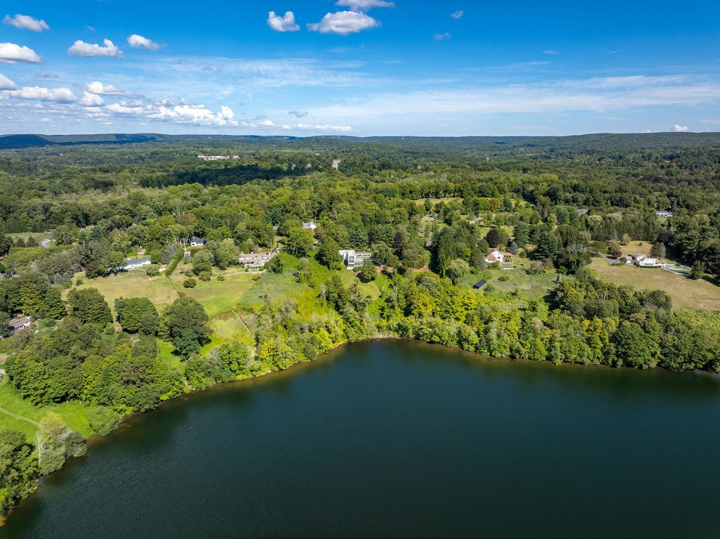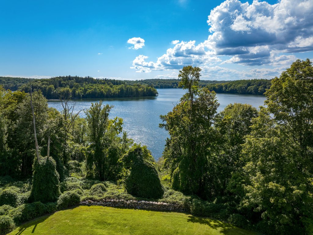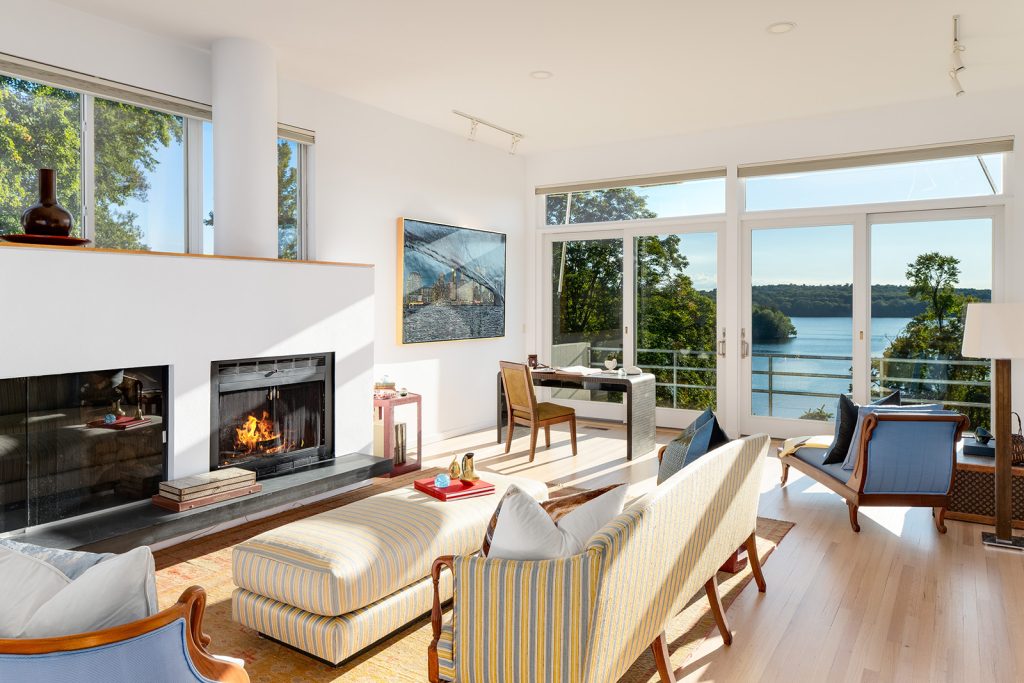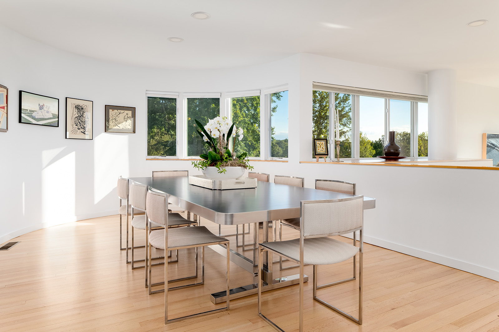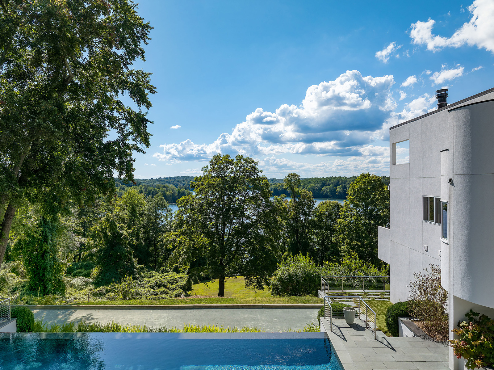 Inside the 3,740 sqft property sun streams in from wide banks of windows and an expansive skylit entry hall. The watery panorama comes into view in the dining area and sunken living room, separated by a half-wall. A broad terrace with chrome railings sits beyond the glass French doors. A primary bedroom suite upstairs has a similar terrace with views over forest and water. There are four bedrooms overall, plus three full bathrooms, one powder room and a Bocci court below the pool.