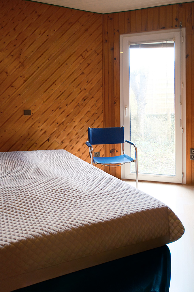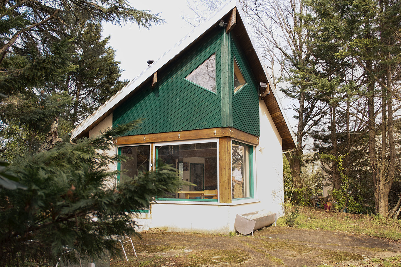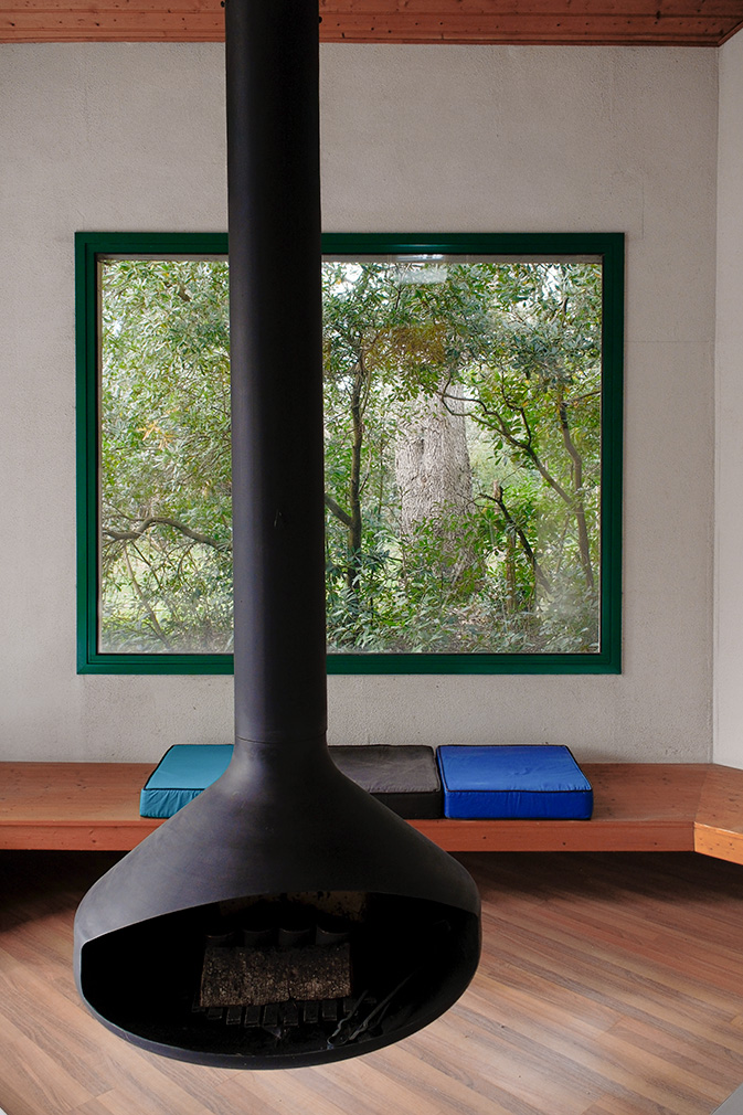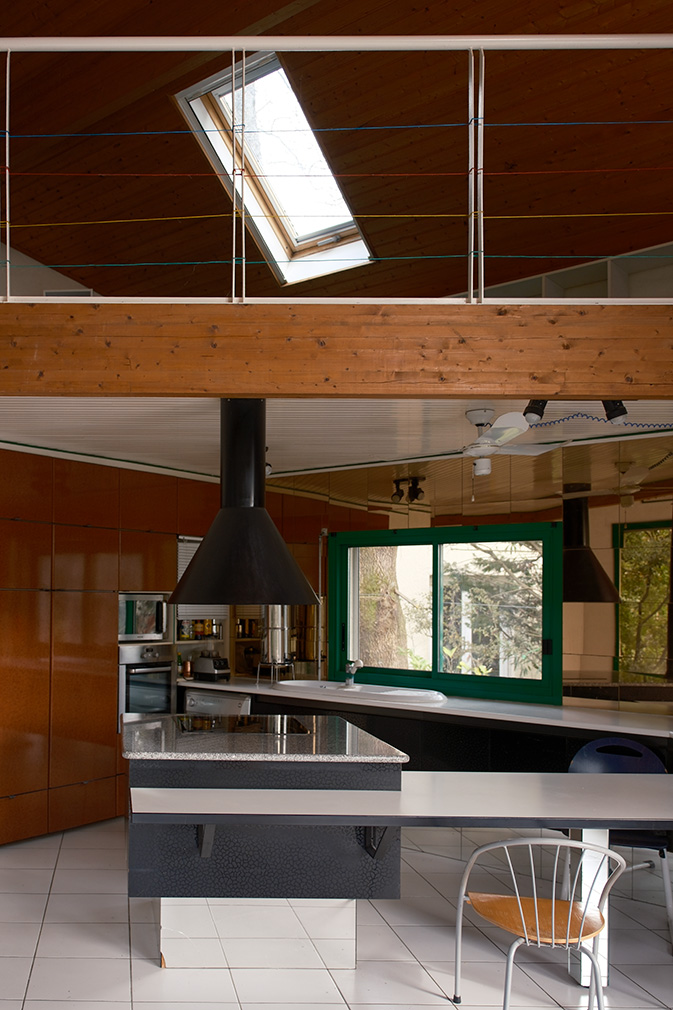 Completed in the 1990s deep within a wooded plot in Mérignac, outside Bordeaux, this house is composed of two polygonal volumes. The central entrance serves as a connection point; it expands into a study and separates the living and sleeping areas, all decorated in De Stijl-inspired primary colour.