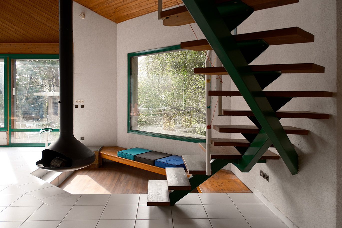 The kitchen remains open to the living space, combining black metal, bronze glass and ceramic surfaces. A stair with a green metal stringer and elm treads leads to a mezzanine overlooking the room, with additional space for flexible use. Three bedrooms are arranged at ground level and share a bathroom, with a separate utility space completing the plan.