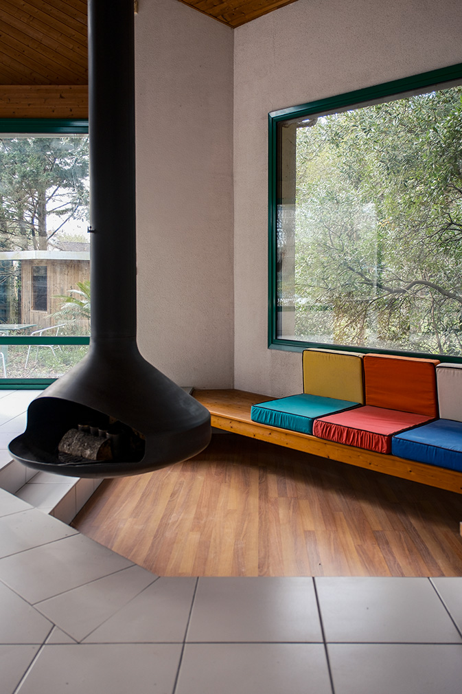 The main, double-height living space opens wide to the surrounding landscape. A pine structure is expressed through three substantial beams, rising to a peak marked by triangular windows. Timber panelling lines the interior. A built-in elm bench sits alongside a suspended Ergofocus fireplace, positioned in front of a large fixed window.