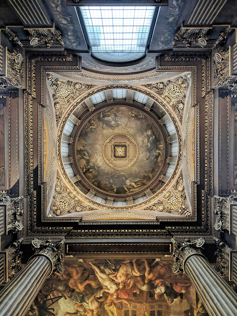 Sir James Thornhill spent nearly 20 years creating the Baroque maritime scenes that cover 40,000 sq ft of ceiling and walls of the room, which sits inside the Old Royal Naval College, designed by Sir Christopher Wren.