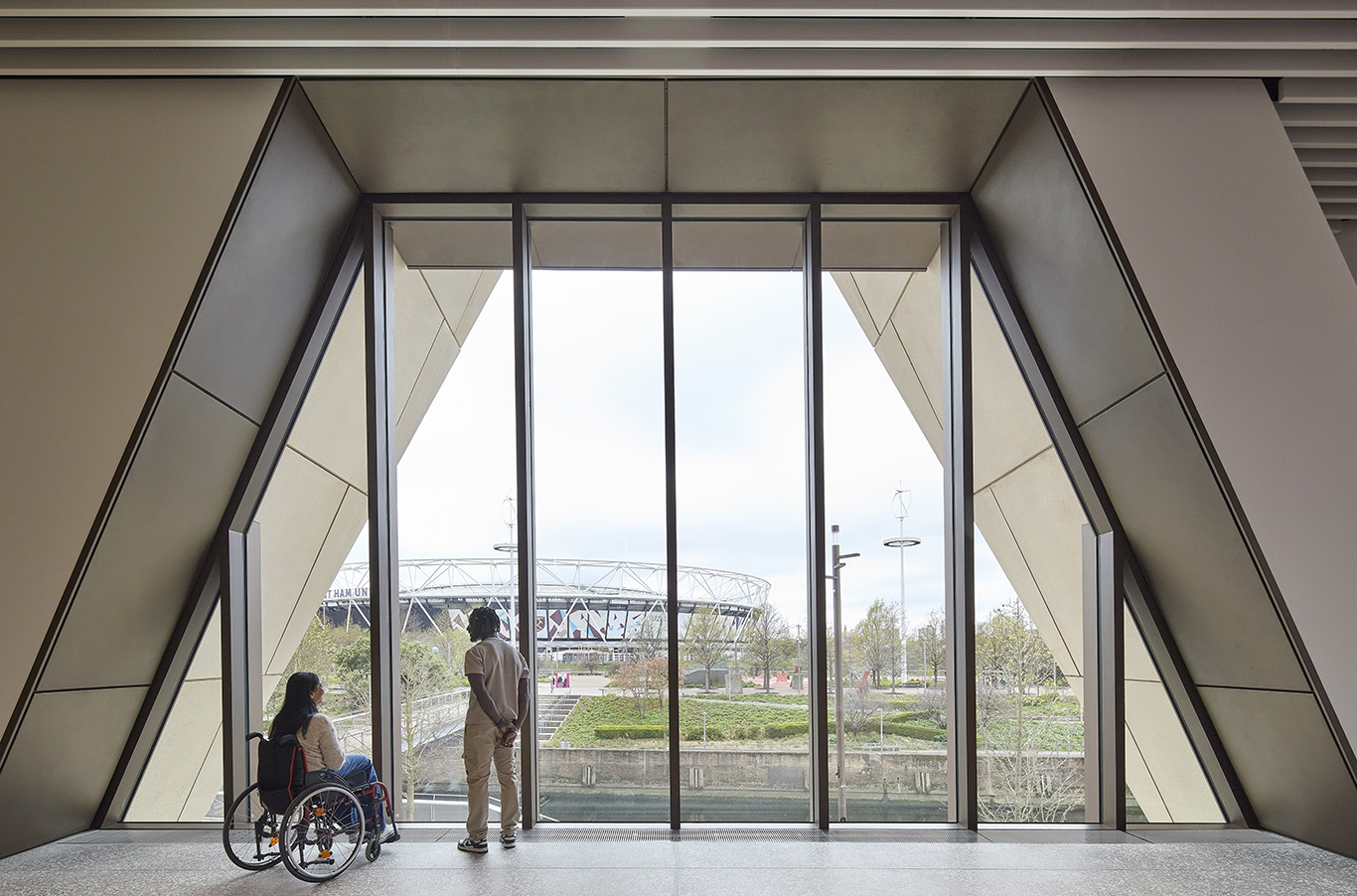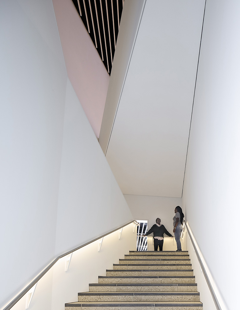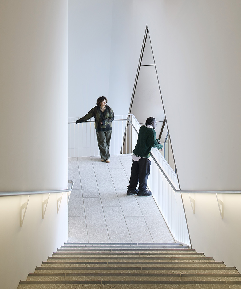 Asked to avoid picture windows, the architects lifted the ‘fabric’ of the lower walls to reveal A-shaped glazing — Tuomey describes the facade as ‘lifting like an eyelid, as if the building had just woken up’. The pointed glass rises high enough that visitors on the first two floors can see some distance through Stratford. ‘The openings have depth,’ he says. ‘They make a solid building feel more open.’