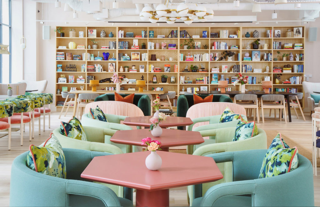 Other amenities on offer at the coworking space include a pea-green and chequerboard tea room with latticed walls; a Gaudi-inspired beauty room decked out in Spanish tiles; a portrait gallery dedicated to women who are leaders of their industry and nursing rooms for new mums. There’s also an extensive wall library, stocked with books by female authors.