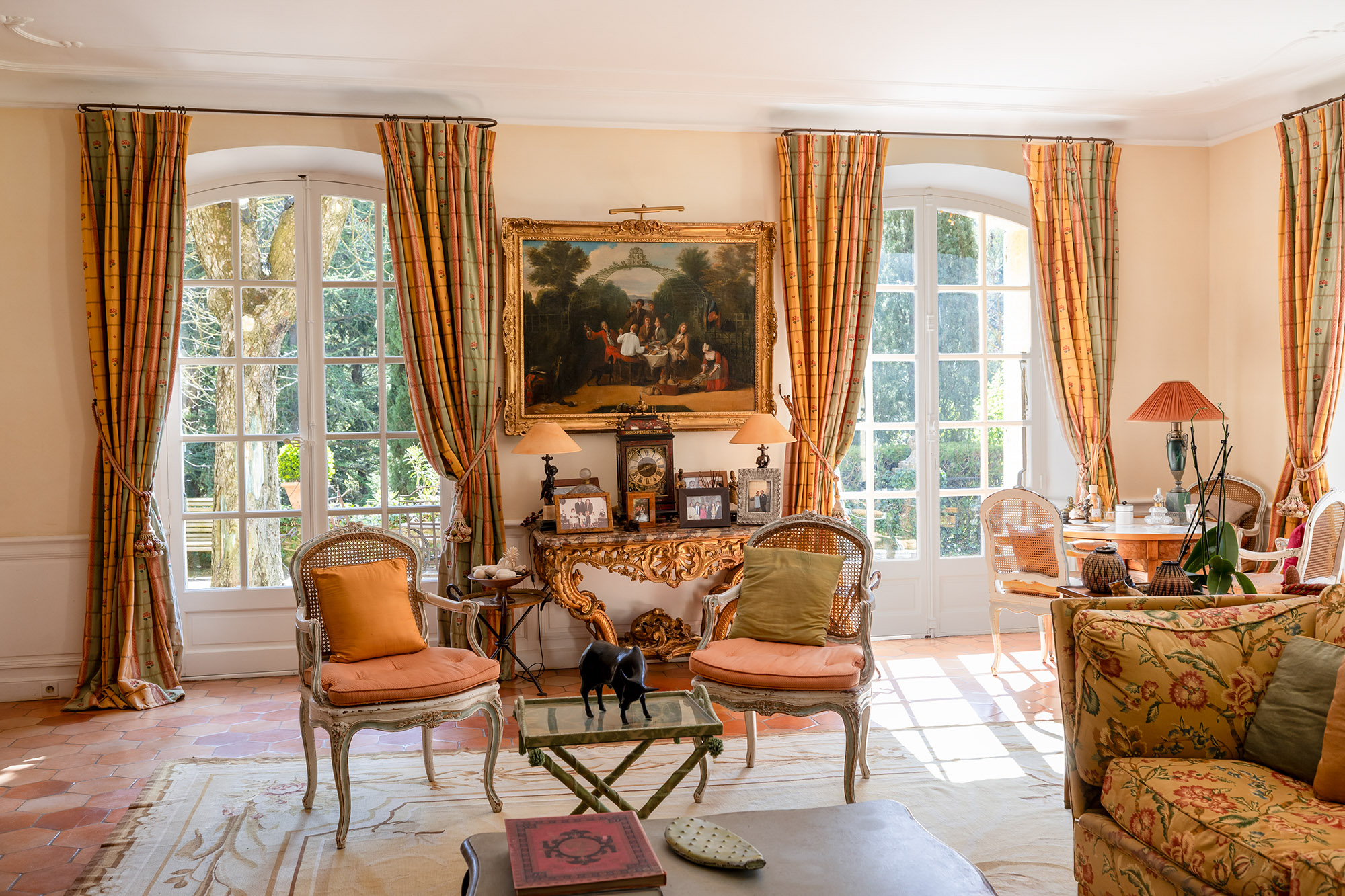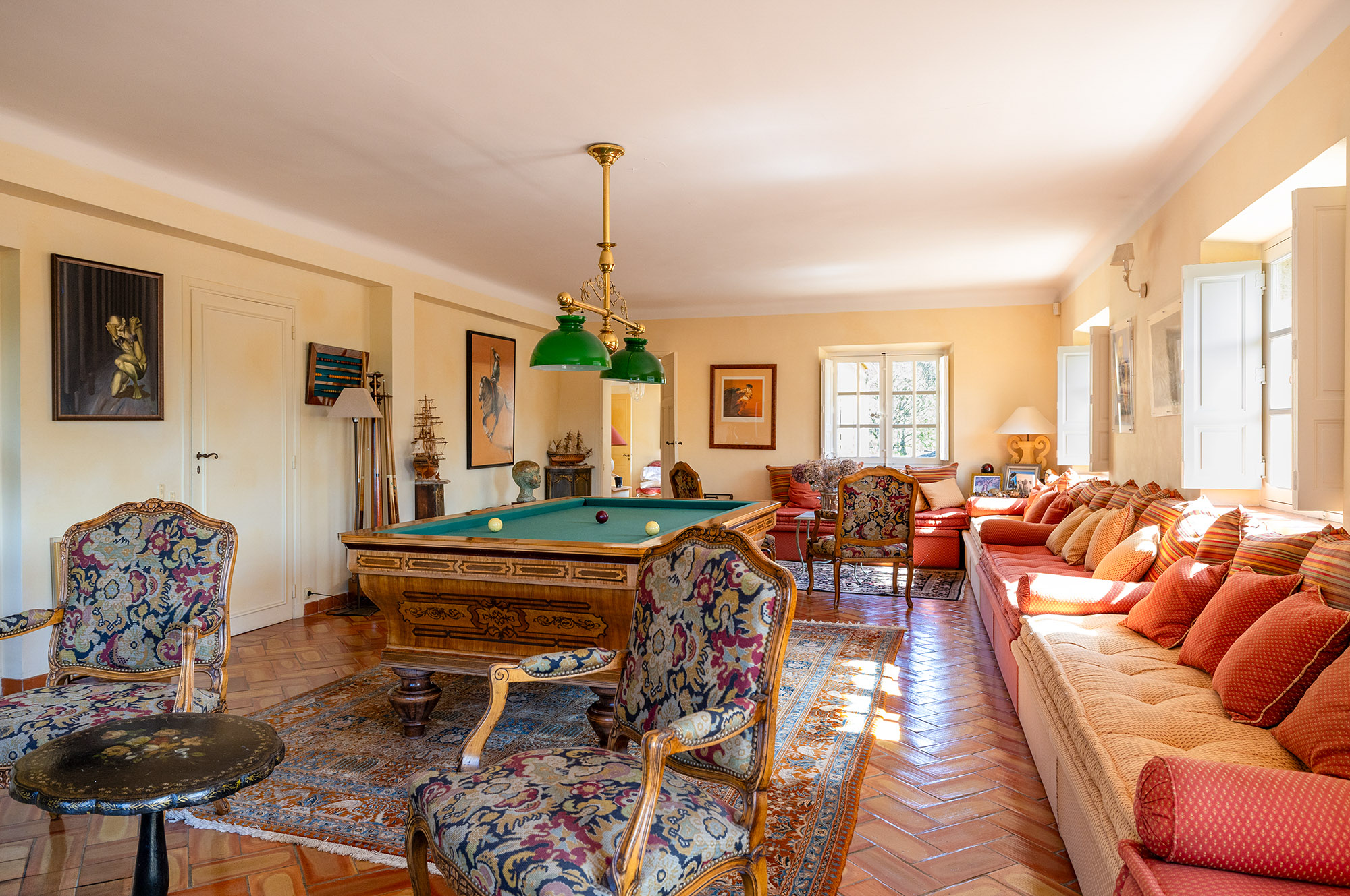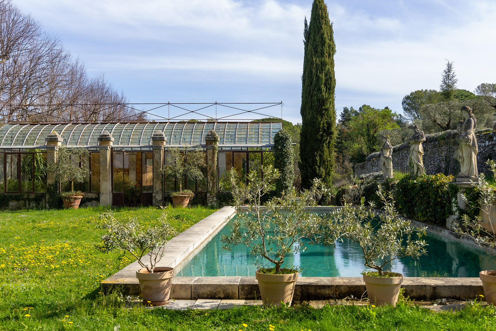 The main bastide extends across approximately 900sqm over three levels. Its plan is arranged with 13 en-suite bedrooms and a series of large reception rooms oriented towards the surrounding grounds, allowing movement between interior and garden throughout the day. A glass-roofed orangery runs parallel to a long rectangular pool, framed by stone columns, statuary and low planting.