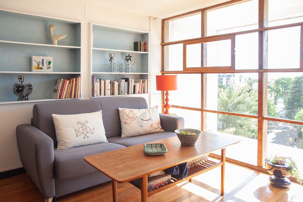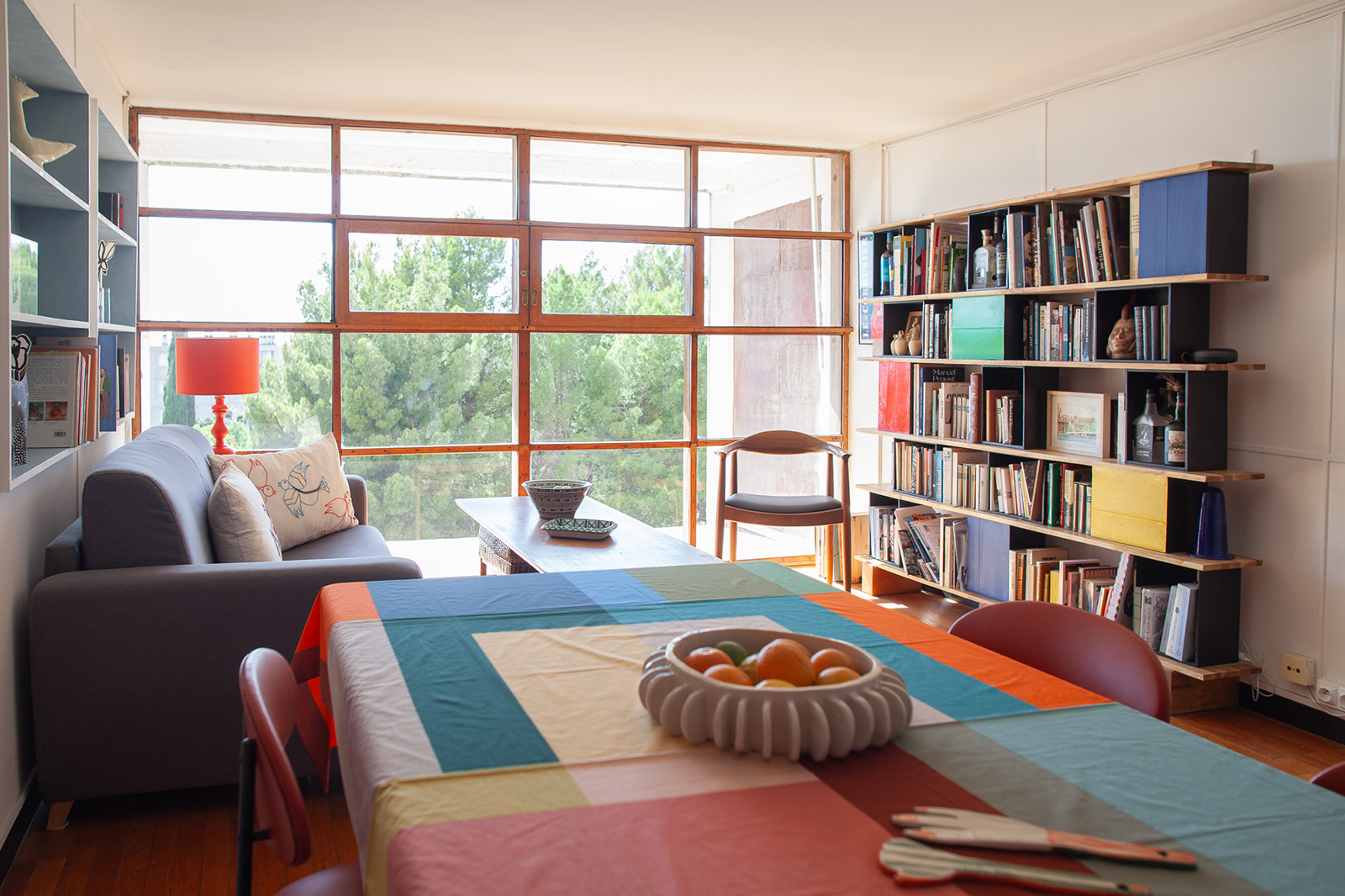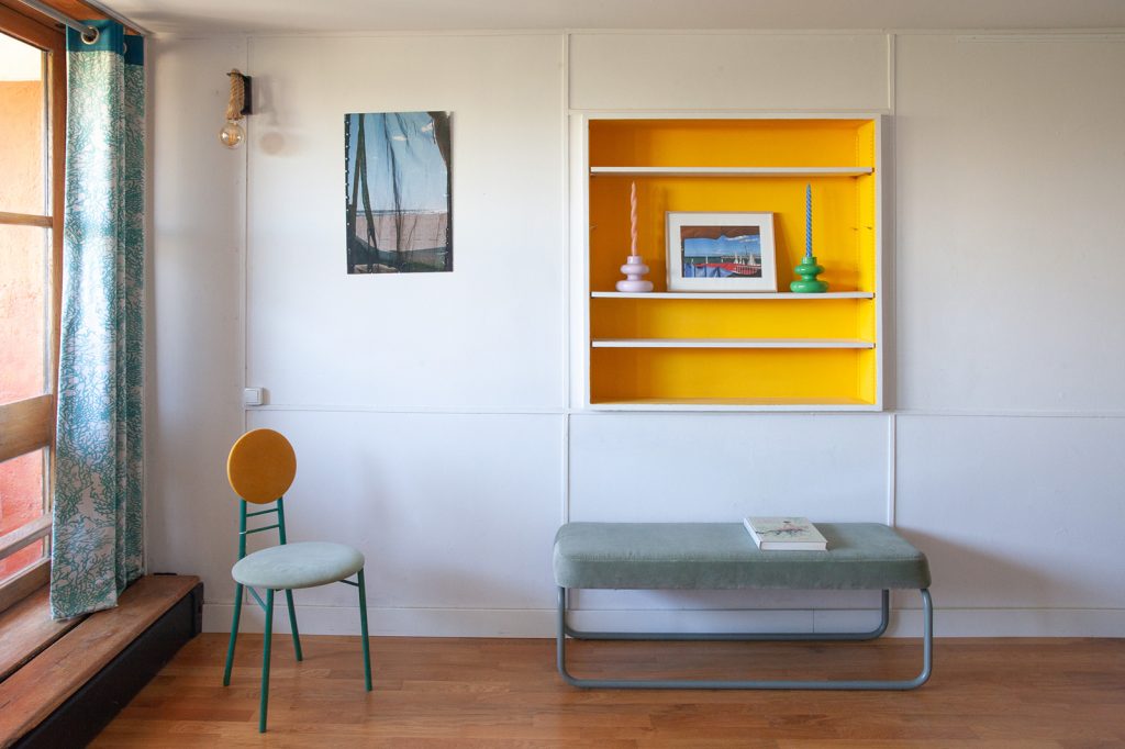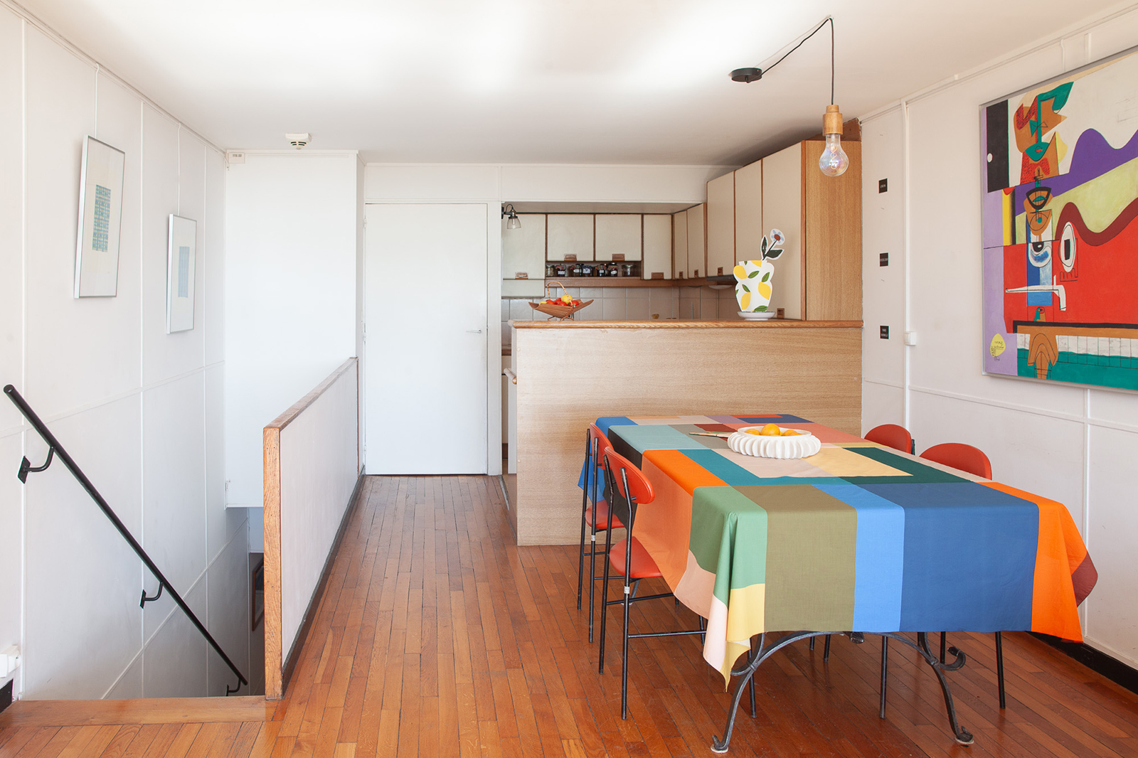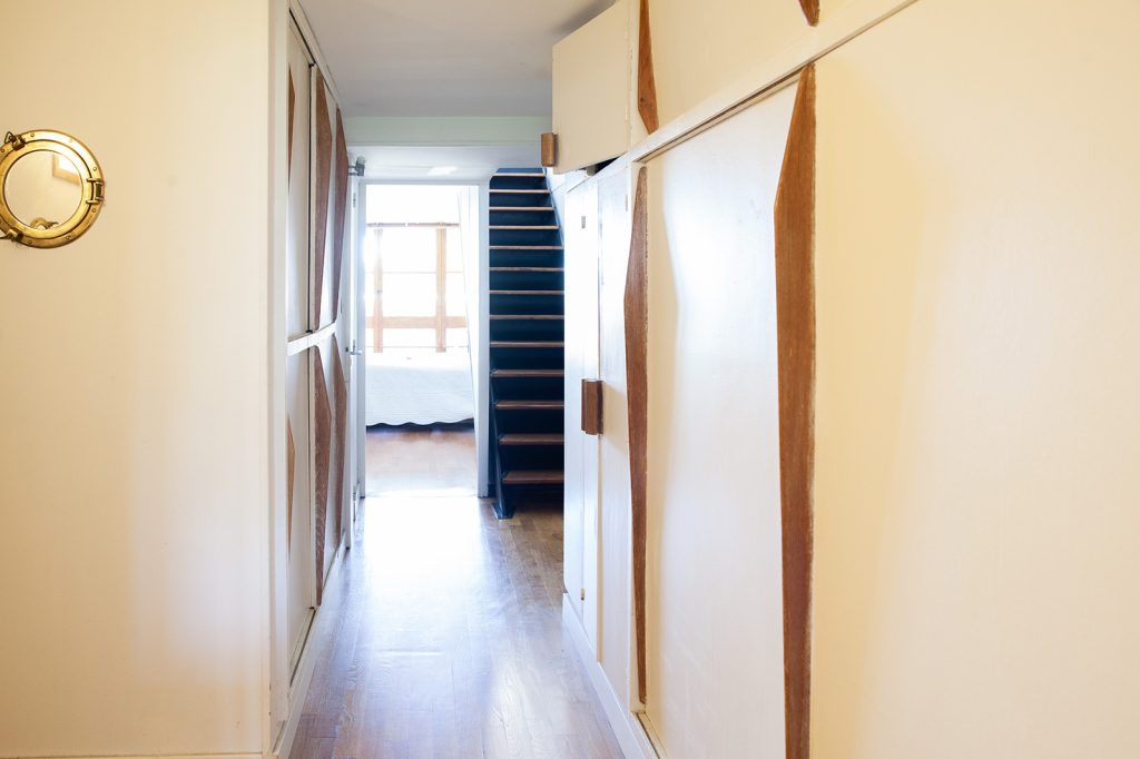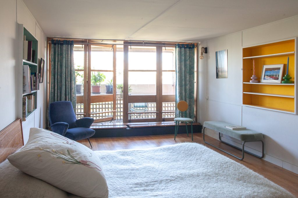 The decor of the current owner is deeply inspired by Le Corbusier’s use of colour. The architect applied primary-coloured panels to doors and walls inside and on the exterior. This particular duplex, a Type E category, is asking 495,000 euros.
