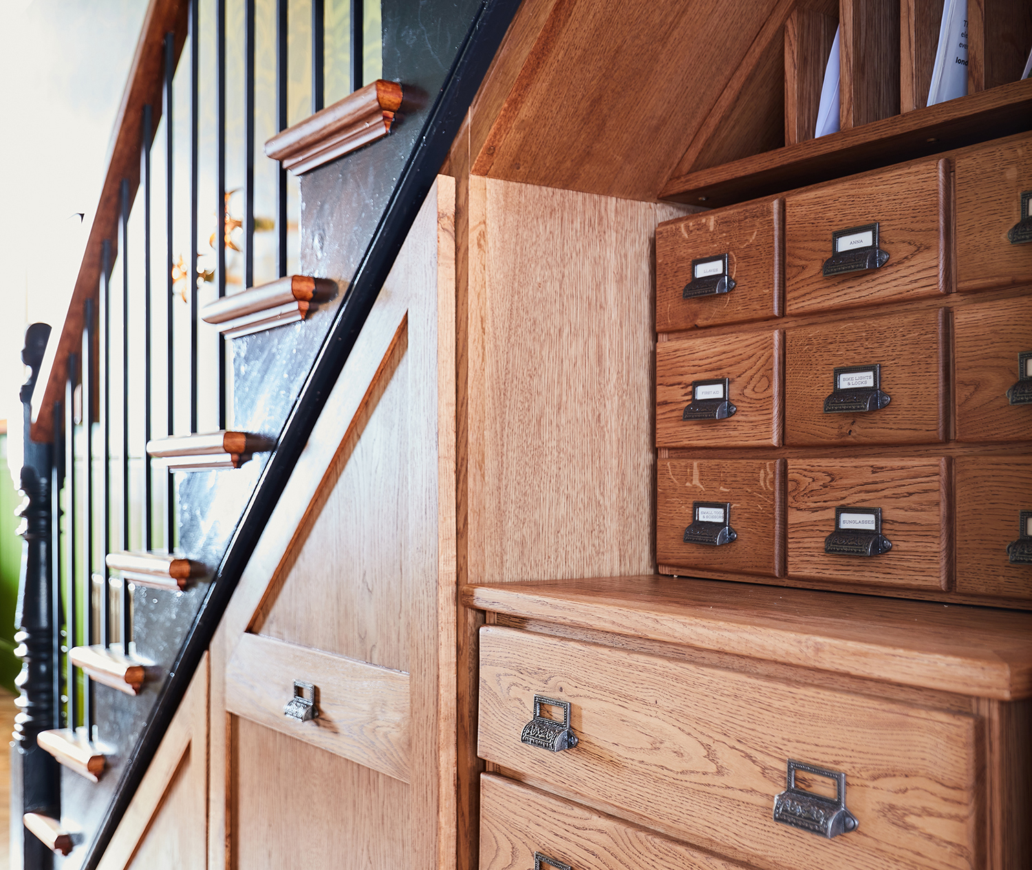 Old school reigns at this home in Queen’s Park, where made-to-measure cabinetry takes on a raw, traditional quality. The under-stairs storage unit, complete with vintage office-style pigeonholes, is a prime example of working within a challenging space to create lived-in charm and period character that complements the home. ‘The joinery in our house was a collaborative effort with our joiner, Ed Davenport,’ says Anna Burles, co-founder of interiors and branding studio Run For The Hills. ‘We designed it and he built it. The pigeonholes and little drawers have been so useful — for batteries, first aid, small tools, sunglasses. Having so many means there’s always a place for those things. And little name tags make it easy to change what’s inside.’
