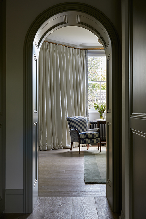 The curved door opening at this Streatham home is deeper than most as it runs beneath the stairwell and disguises an air conditioning unit. Bespoke joinery here is used not only to cover up an unattractive feature but to link a suite of rooms. The master bedroom, dressing room and en suite are also tied together courtesy of the sage-green palette. ‘This was intended to meet the client’s request for a tranquil and calm escape within these areas of the home,’ says Bari Jerauld, founder of interior design studio Blank Slate. As for the style? ‘I wanted to incorporate traditional architectural details throughout the home, which led to the choice of a shaker-style door with beading along the inner frame to mirror elements found in other spaces.’